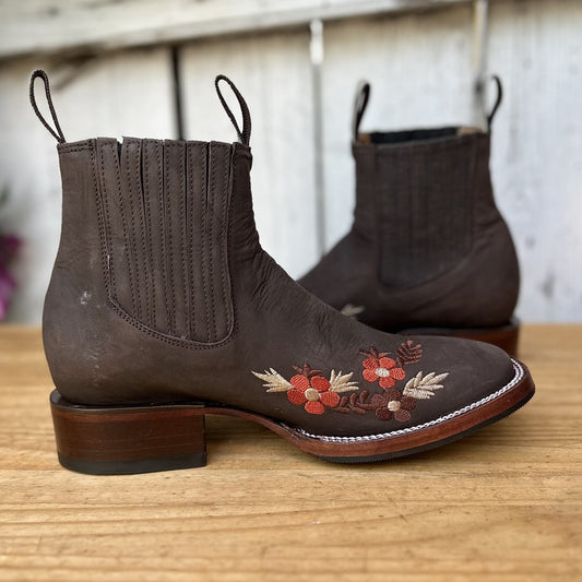 Botin SB-Flores Miel - Botines Vaqueros de Nobuck con Bordado para Mujer