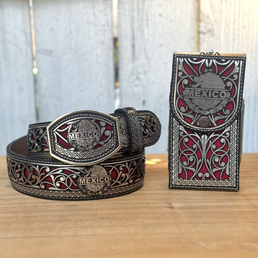 Cinturón Cortado a Láser "Mexico" Plateado y Funda Vaquera Cortada a Láser