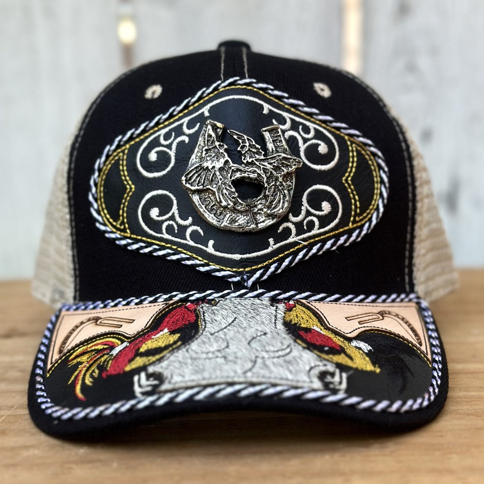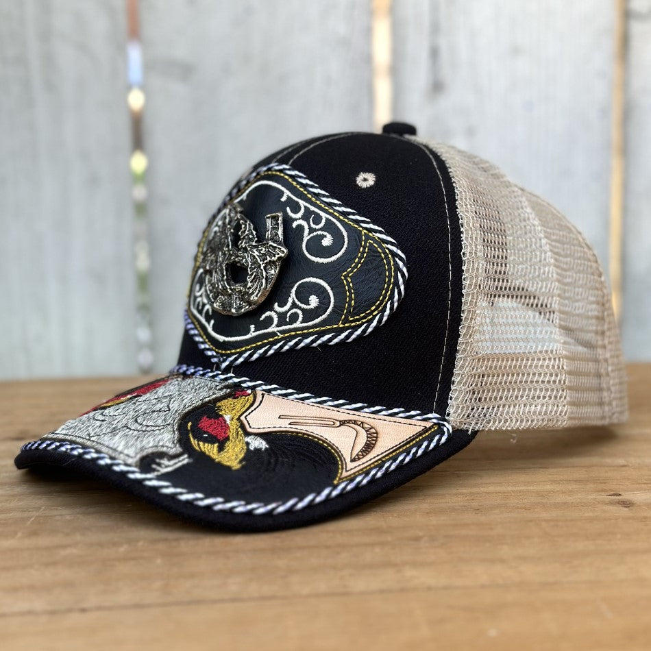 Gorra Vaquera Negra y Beige con Gallos y Herradura - Gorras Artesanales Mexicanas