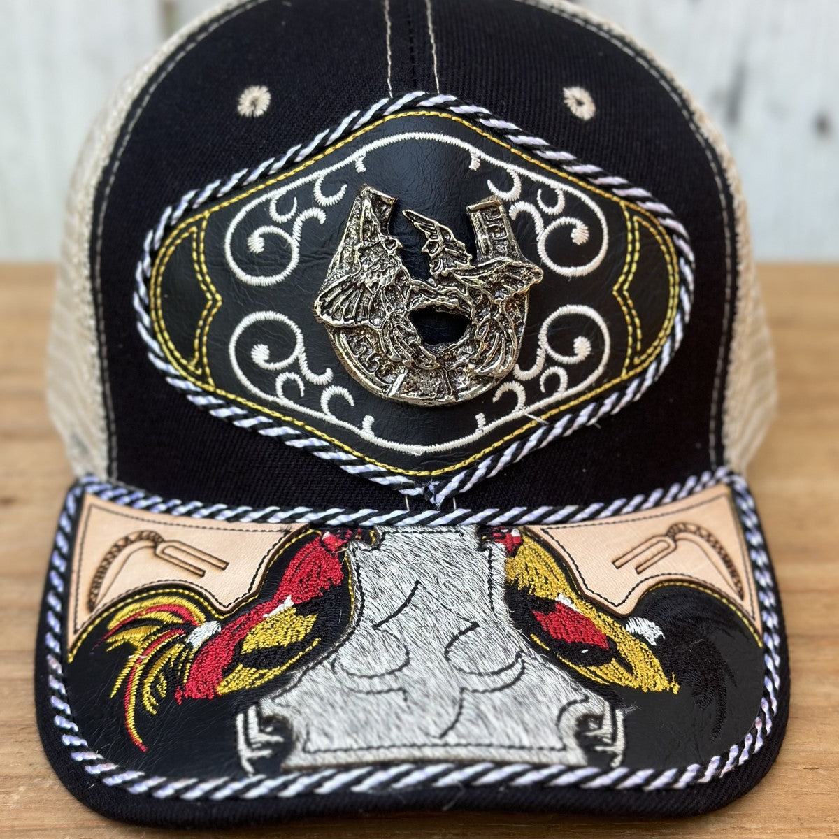 Gorra vaquera color negro y beige con diseño de dos gallos y una herradura. Hecha artesanalmente en México, cuenta con detalles hechos a mano, pelo de res original, y dos gallos bordados en la visera. Esta gorra es única; es literalmente una de una.