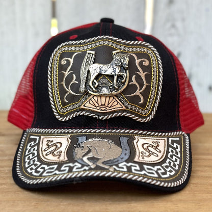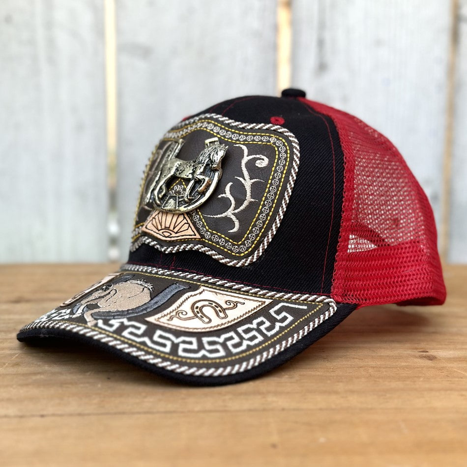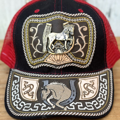 Gorra Vaquera Roja y Negra con Caballo y Herradura - Gorras Artesanales Mexicanas