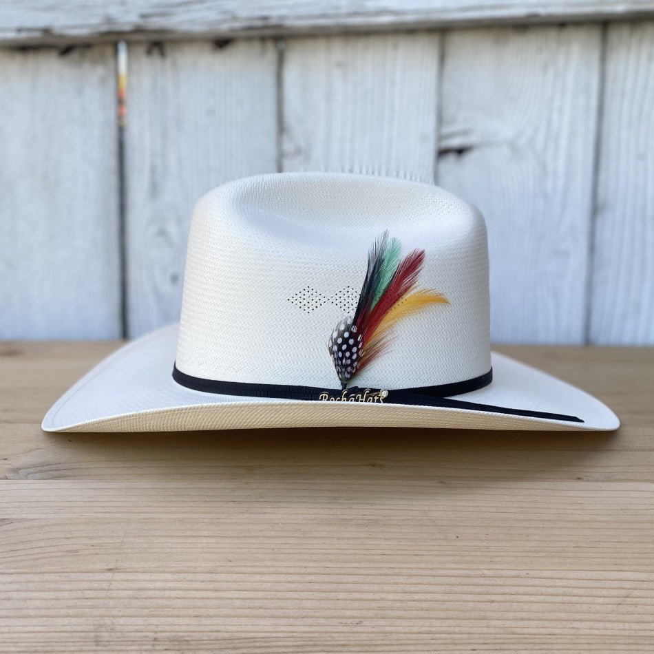 El sombrero vaquero 100X Fantasma de Rocha Hats, apreciado por su estilo, incluye una elegante pluma de adorno de 4". Este sombrero, con su calidad superior 100X, ofrece una falda de 3 1/4" y una copa de 4 1/2". Fabricado en México, este sombrero combina tradición y un toque distintivo, perfecto para los entusiastas del estilo vaquero que buscan un accesorio con carácter y calidad.