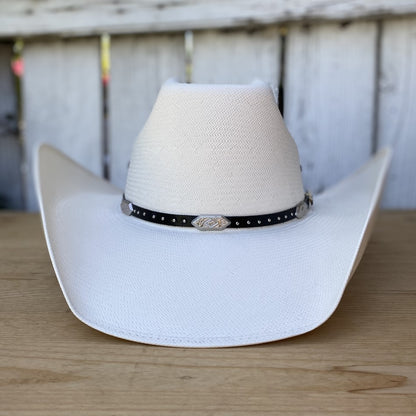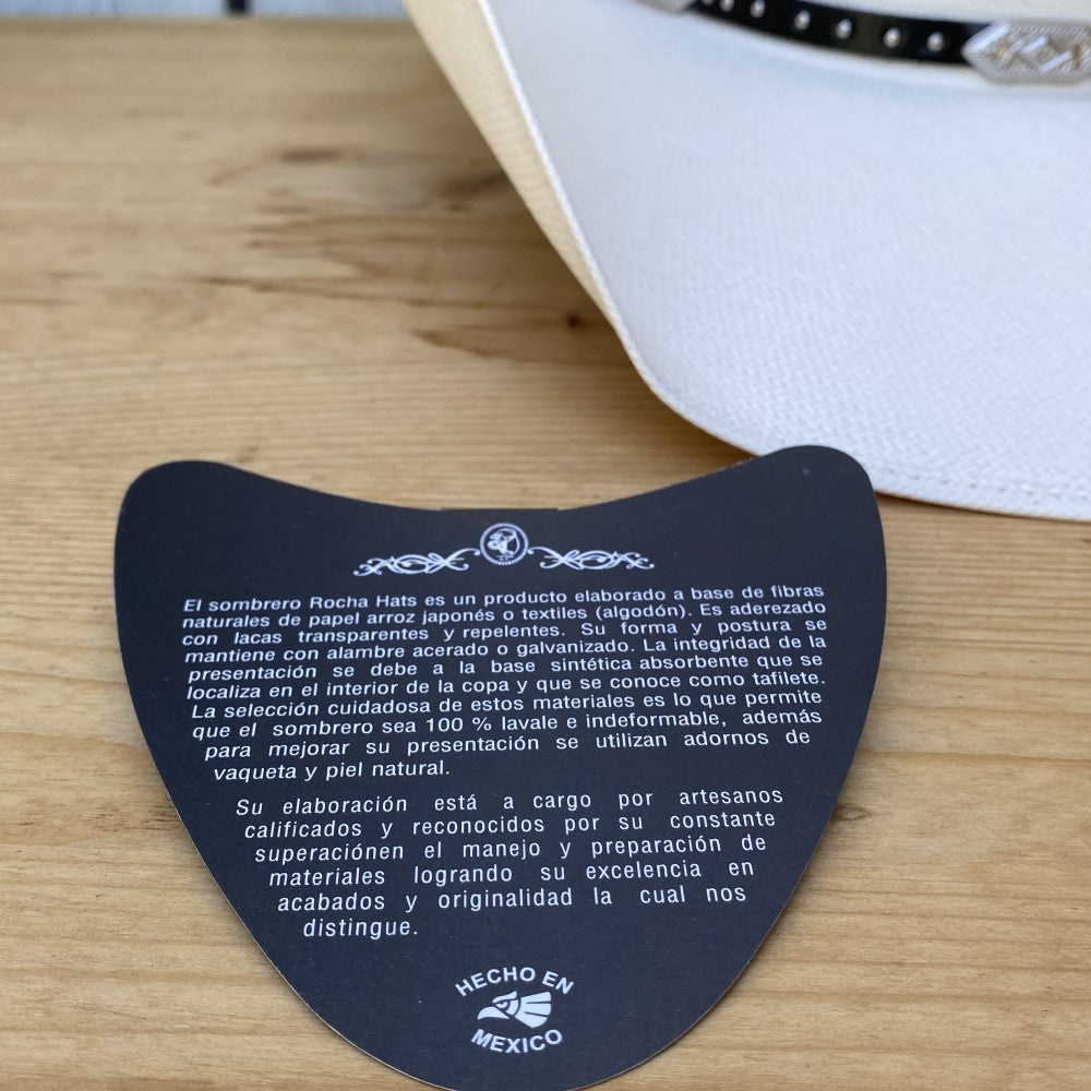 El sombrero vaquero 100X 8 Segundos de Rocha Hats es un sombrero cómodo y funcional con la reconocida horma 8 Segundos. Las toquillas varían, pero cada una ha sido seleccionada para realzar la estética del sombrero, asegurando que cualquier variante mantenga la elegancia del diseño. Hecho con fibras naturales de papel arroz japonés, este sombrero cuenta con una falda de 4 1/4" y una copa de 4 1/2", ofreciendo un estilo clásico y contemporáneo. Confeccionado en México, es ideal para el hombre que busca confort y estilo en su vestimenta vaquera.