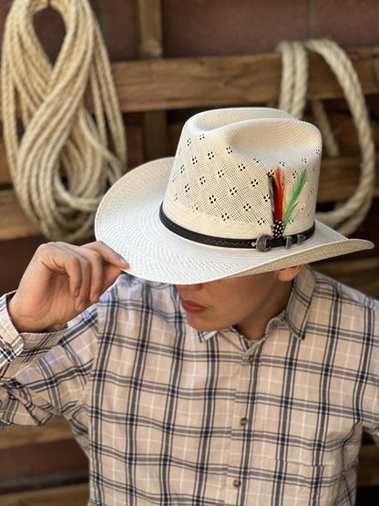 El sombrero 30X El Viejonon Randa de Tombstone Hats se caracteriza por su copa alta de 5 1/2" y falda corta de 3 1/4", ofreciendo una silueta impresionante. La ventilación detallada alrededor de la copa, junto con una pluma decorativa, aporta un toque único. Este sombrero, confeccionado en México, es una pieza destacada para cualquier aficionado al estilo vaquero.