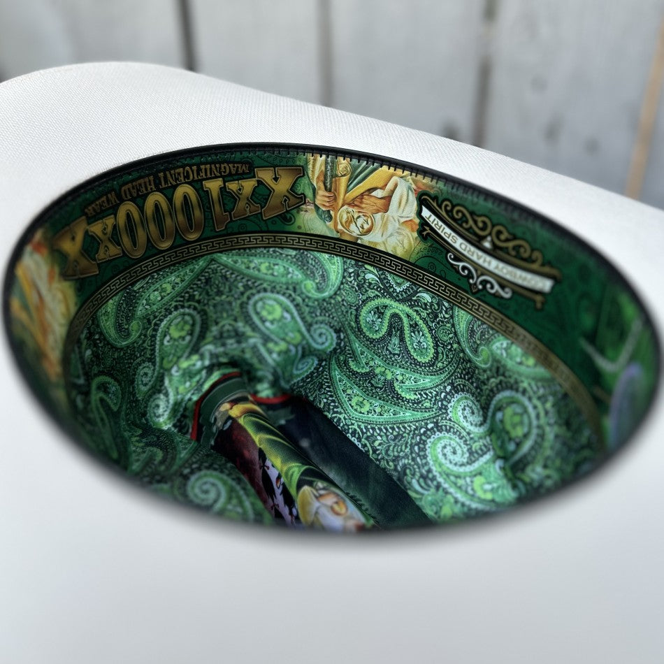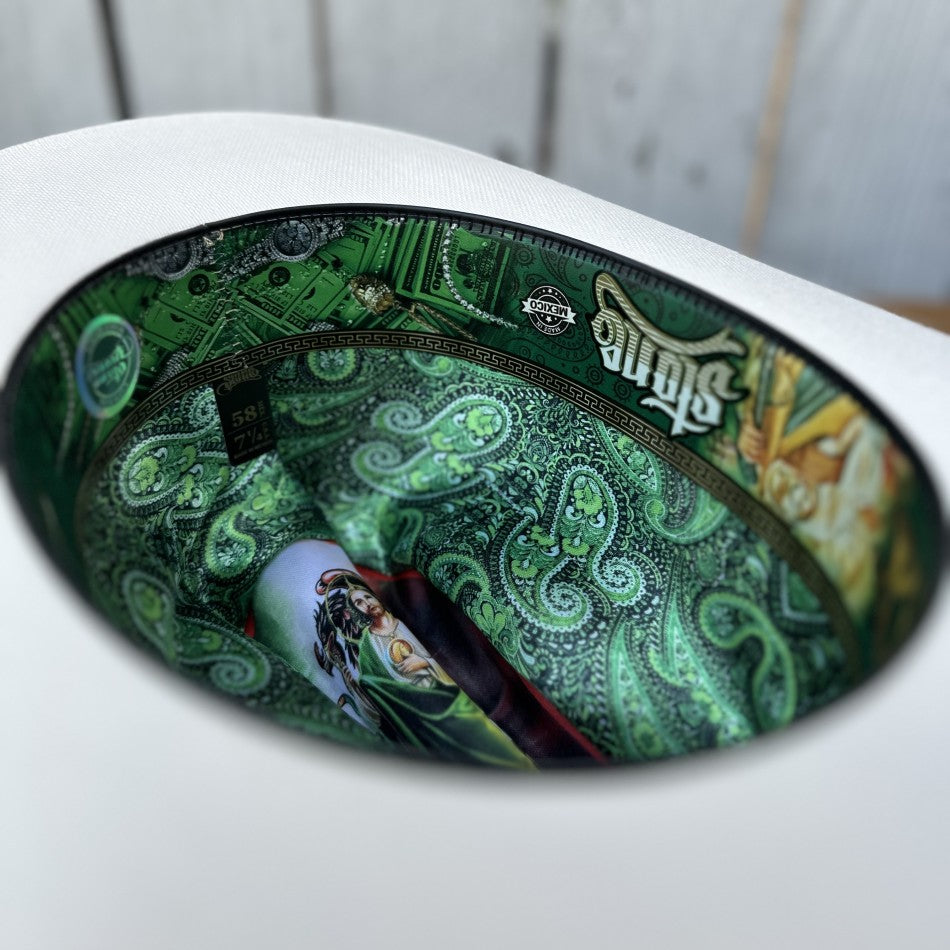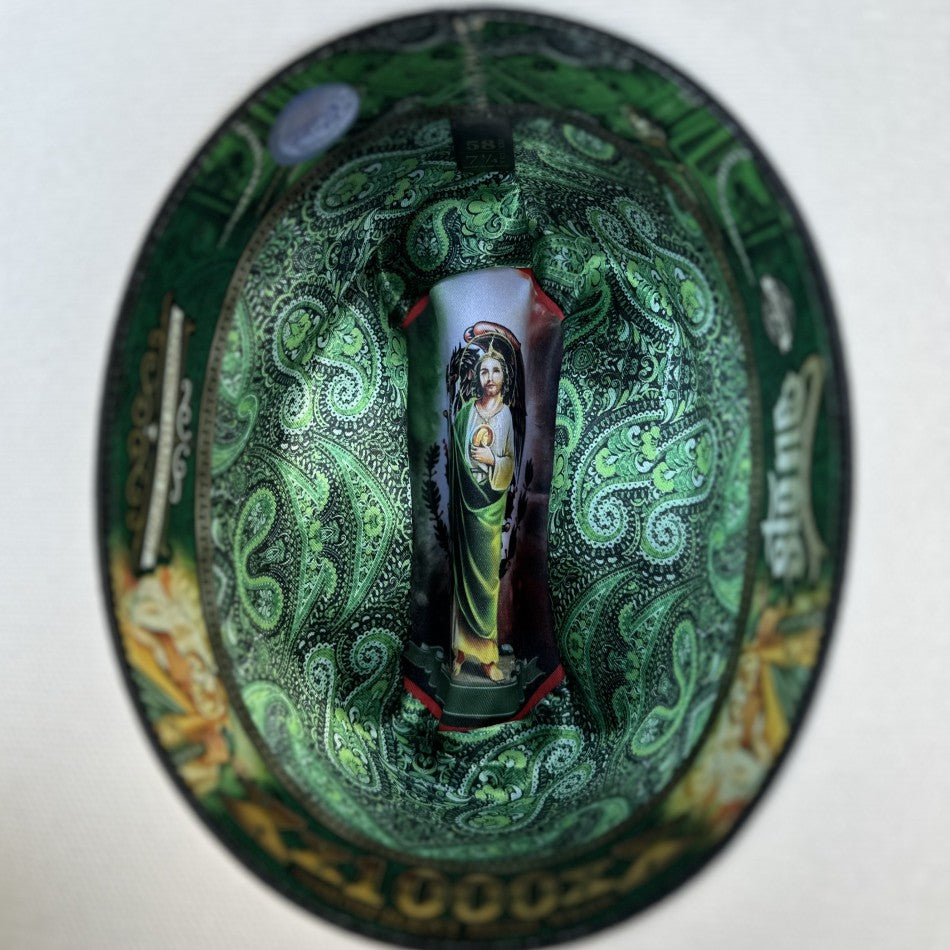 Este es el estilo 1000X Chaparral Sinaloa San Judas. Un sombrero vaquero con un diseño especial para los devotos de San Judas, fabricado con material Telar Master 1x1 de alta calidad. Tiene una copa de 4 1/2” y una falda de 3 1/4”, brindando una estructura firme y bien definida. En la toquilla se encuentra una imagen de San Judas, detalle que resalta su carácter distintivo. Además, el interior cuenta con un forro y tafilete con la imagen del santo, agregando un toque único. Hecho en México, es un sombrero muy económico que combina fe y estilo vaquero.