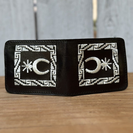 Black Leather Western Wallet with Metallic Bull, Cowhide and Greek Key Embroidery