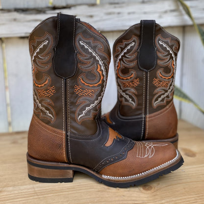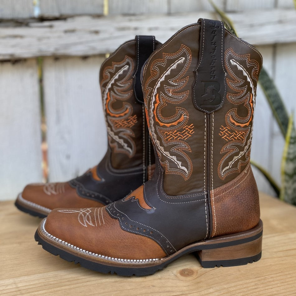This is the 010H Torito western boot for men, a shoe that encapsulates the essence of cowboy style in crazy mocha and tan tones. With a 10-inch shaft height and 1 3/4-inch heel, this boot perfectly combines tradition and comfort. Made with leather upper, lining and insole, it guarantees a perfect fit and exceptional durability. The non-slip and oil-resistant rubber sole is ideal for safe and versatile use. Made in León, Mexico, the 010H Torito is the ideal choice for the man looking for a genuine cowboy boot in his wardrobe.