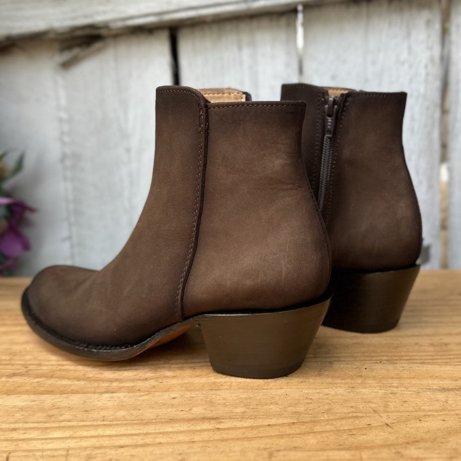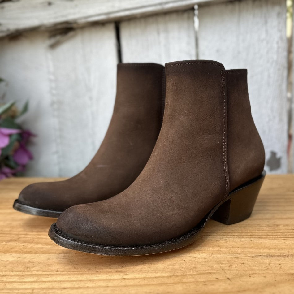 This is the Mónica western ankle boot, presented in brown with an internal zipper for a comfortable and easy put on. Its high-quality crazy leather and higher-than-usual heel come together to offer a distinctive and elevated style. Complete with a cowhide sole and leather lining, this ankle boot made in León, Mexico, is as practical as it is stylish.