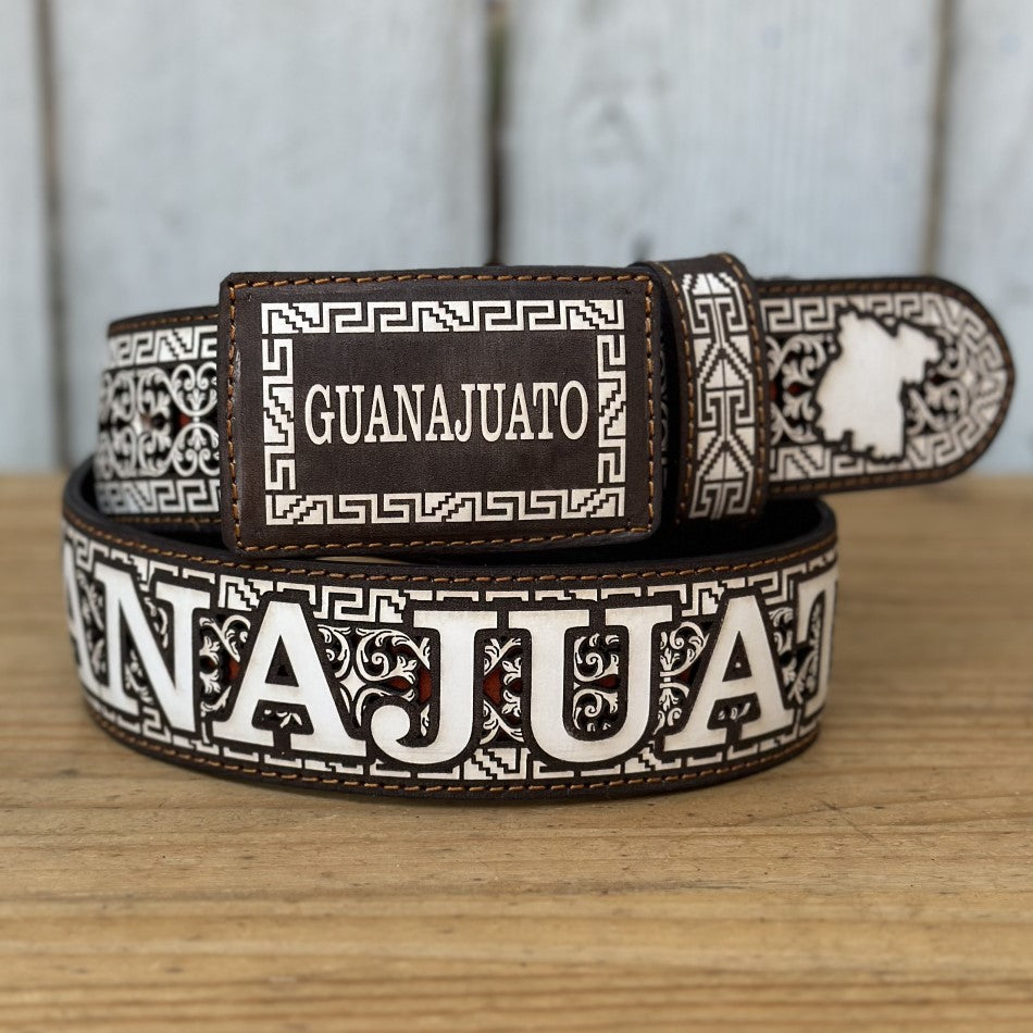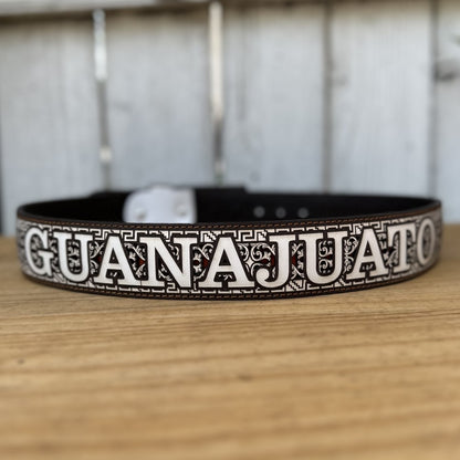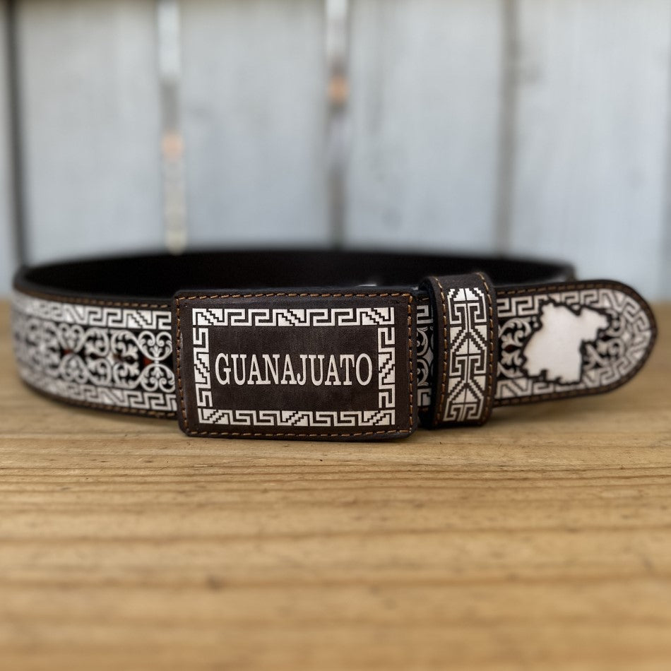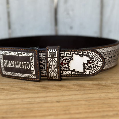 This is the Personalized Guanajuato Belt, perfect for those who want to proudly show off their Mexican state. Measuring 2 inches wide and made of 100% leather, this belt bears the name and outline of the state of Guanajuato on both the buckle and the body of the belt. Details in dark tones with white embroidery add a distinctive and elegant touch. Made entirely in Mexico, it's a great way to show your heritage and roots in style.