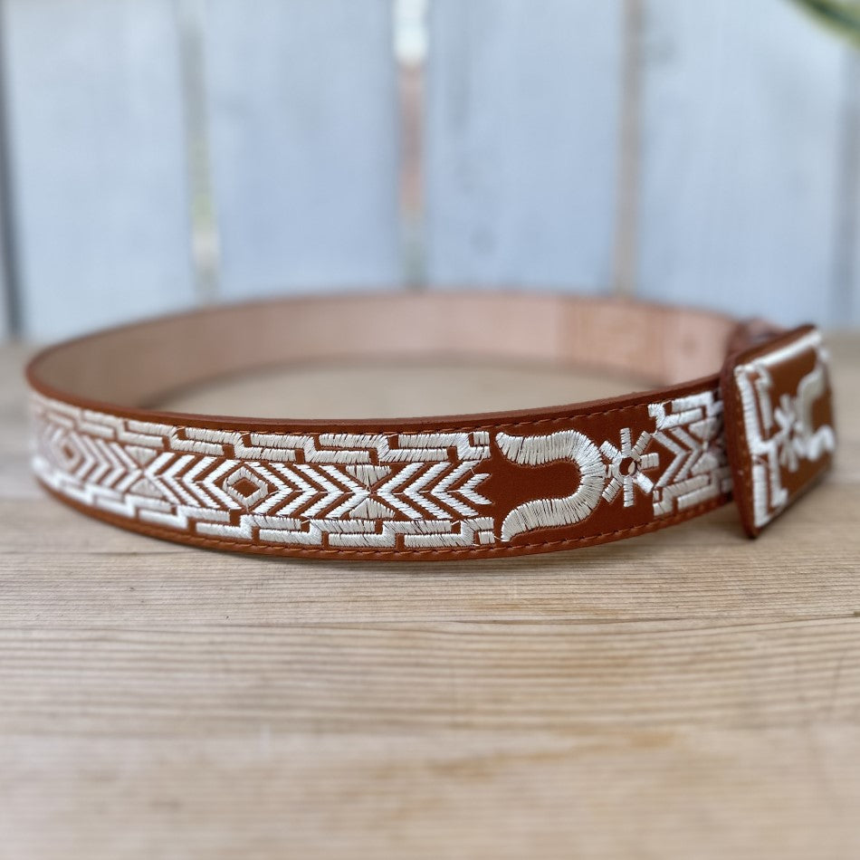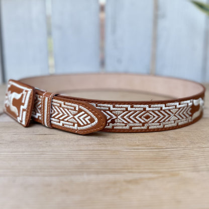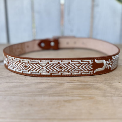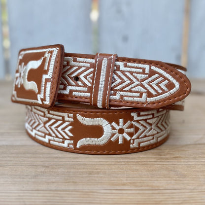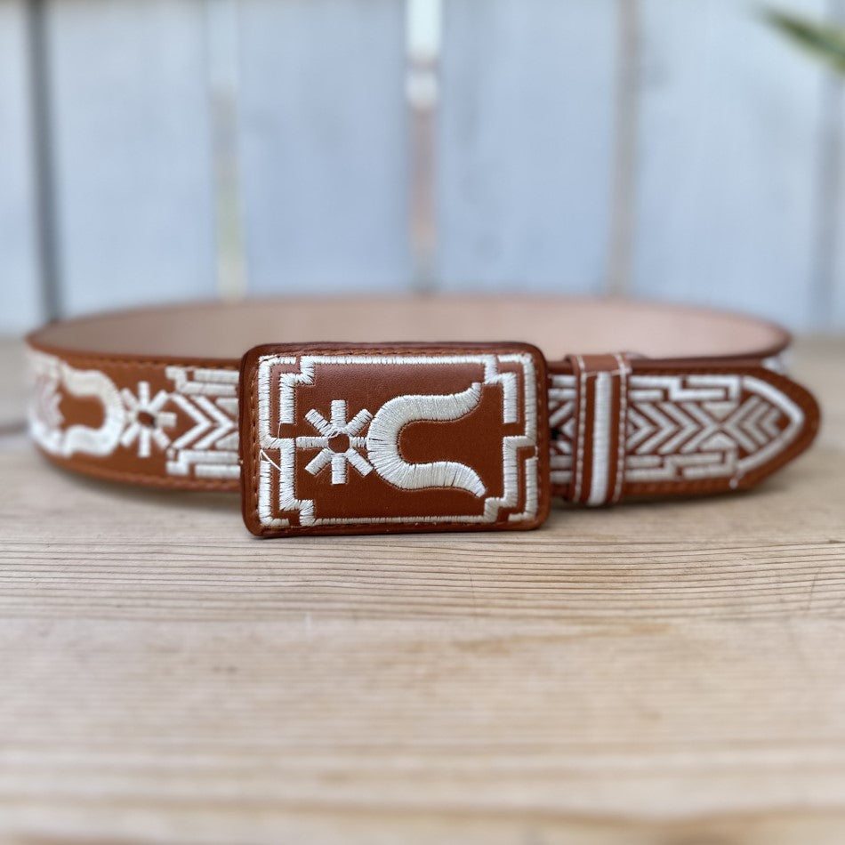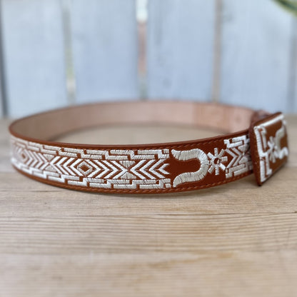 This is the 13134 Natural Spur belt, with an embroidered design that highlights a spur in the center of the rectangular buckle, accompanied by geometric patterns along the belt in a natural tone. Made from 100% genuine leather, it is 1 ½" wide and made in Mexico, reflecting authentic cowboy craftsmanship.