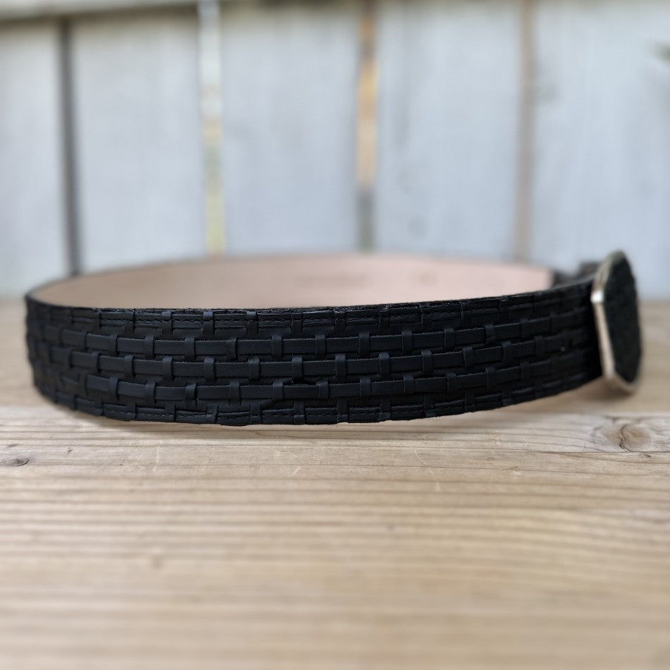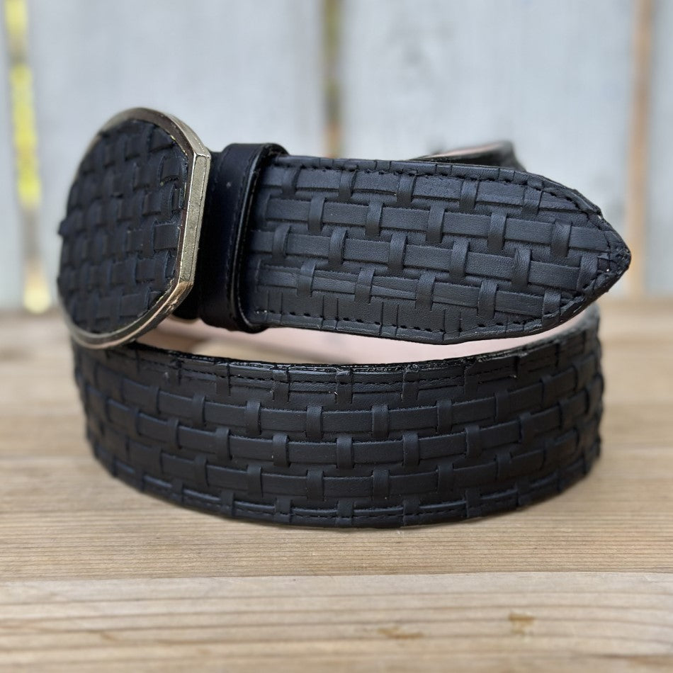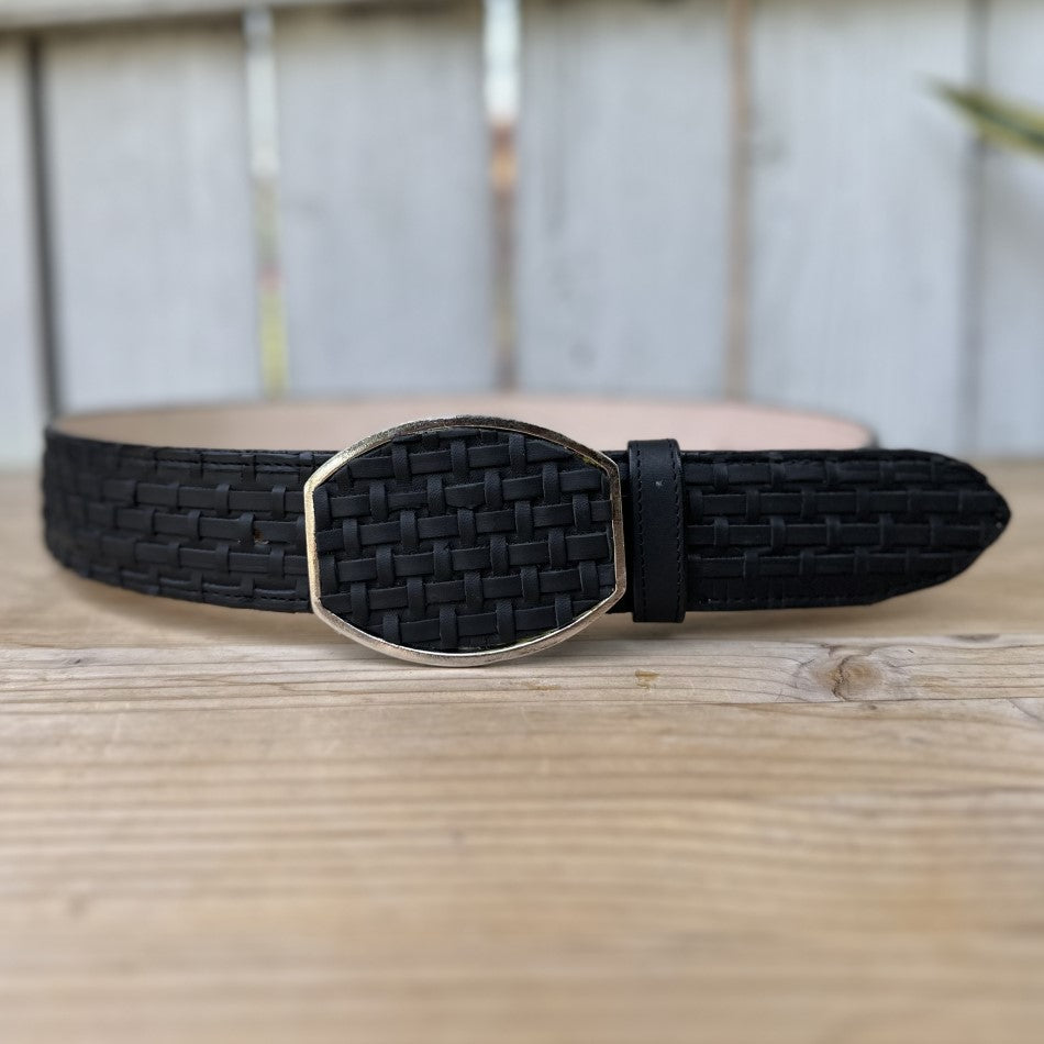 This is the DA-2403 belt, made with meticulous attention to detail in petatillo technique, in an elegant black color that offers versatility for various occasions. This accessory is completely made of genuine leather, which guarantees its durability and comfort. Measuring 1 3/4" wide, this belt includes five rows of holes for a perfect, customizable fit. The metal buckle complements its subtle, elegant design, making this belt an ideal piece for both casual outfits and larger events. Made in Mexico, it is an excellent choice for those looking for a classic style with a distinctive touch.
