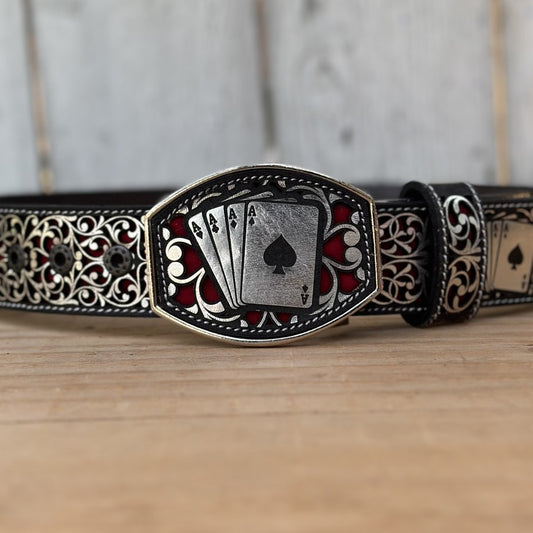 Laser Cut Belt "4 Aces" Silver - Western Belts for Men