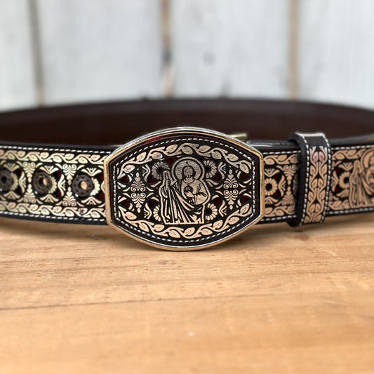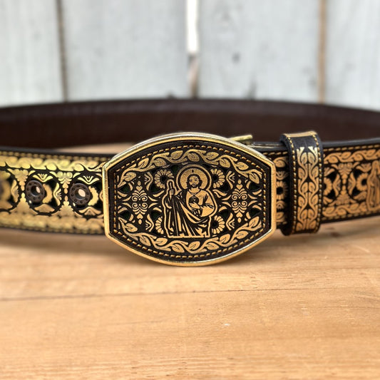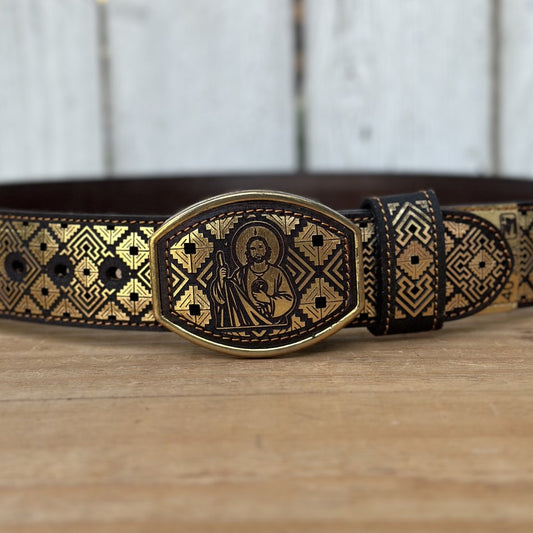Golden "San Judas" 2 Laser Cut Belt - Western Leather Belts