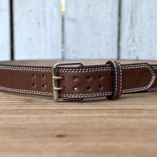 Brown Heavy-Duty Leather Work Belt with Double-Prong Roller Buckle