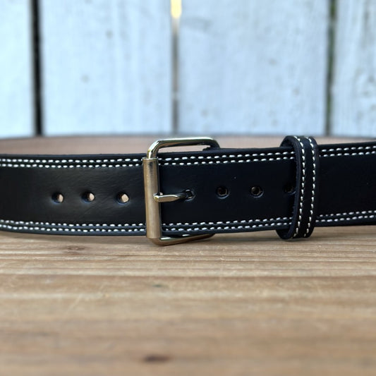 Black Heavy-Duty Leather Work Belt with Double-Prong Roller Buckle