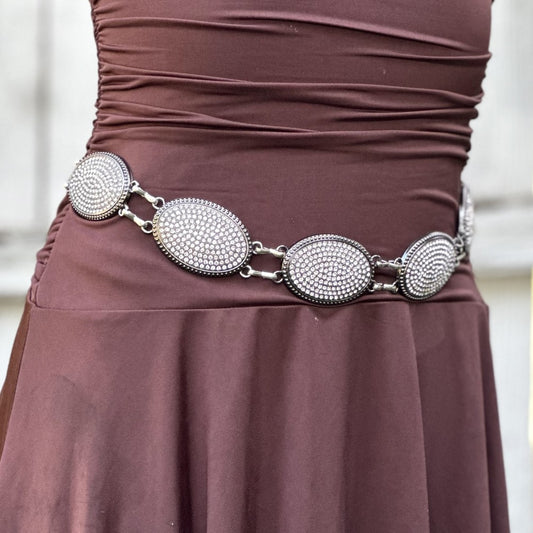 Women’s Western Style Rhinestone Concho Chain Belt with Black Trim