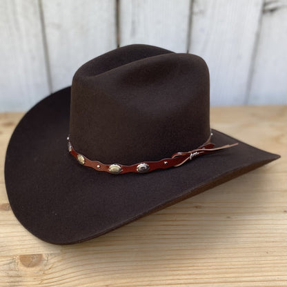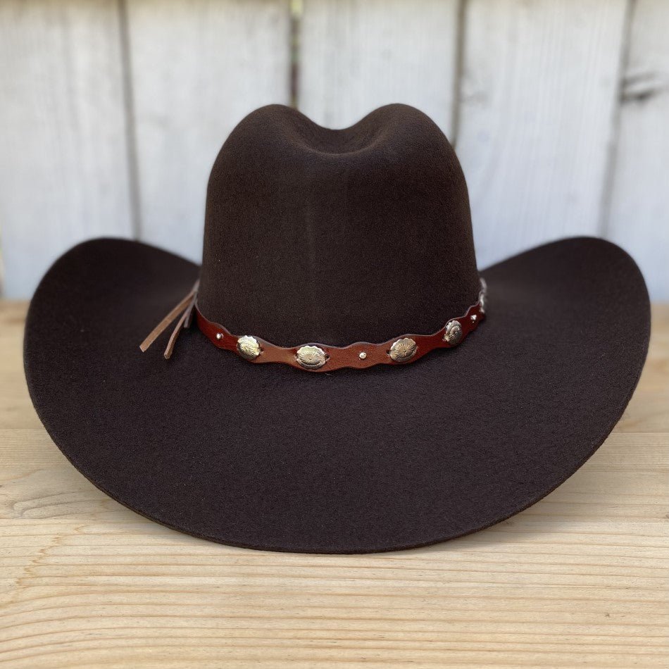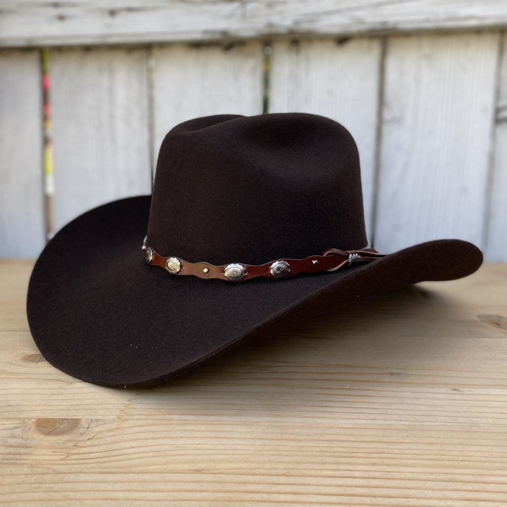 This 20X Denver hat from Tombstone Hats in a unique dark brown color is an expression of elegance and exclusivity. The quality 20X felt ensures durability and comfort, while the hatband accentuates the felt hat with its rich texture and circular metallic ornaments, adding a classic design element that stands out against the dark brown felt. With a 3 1/2" brim and 4 1/4" crown, this western felt hat made in Mexico is perfect for an array of occasions, pairing perfectly with a variety of styles.
