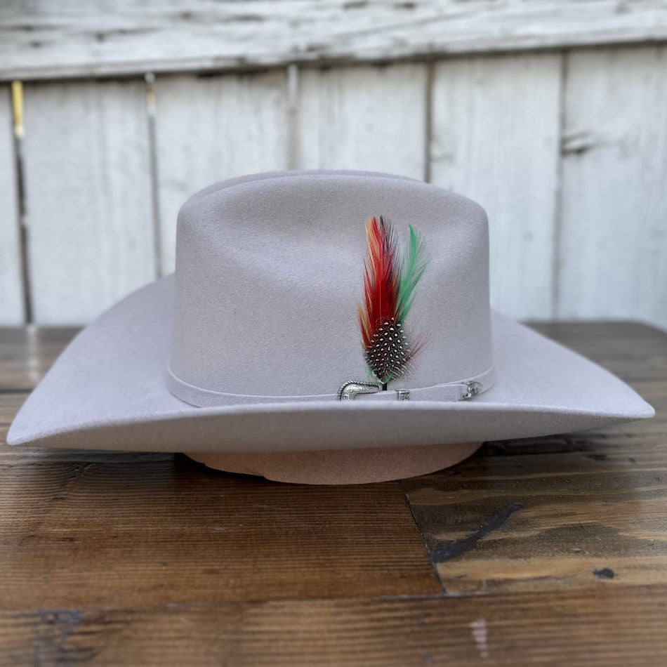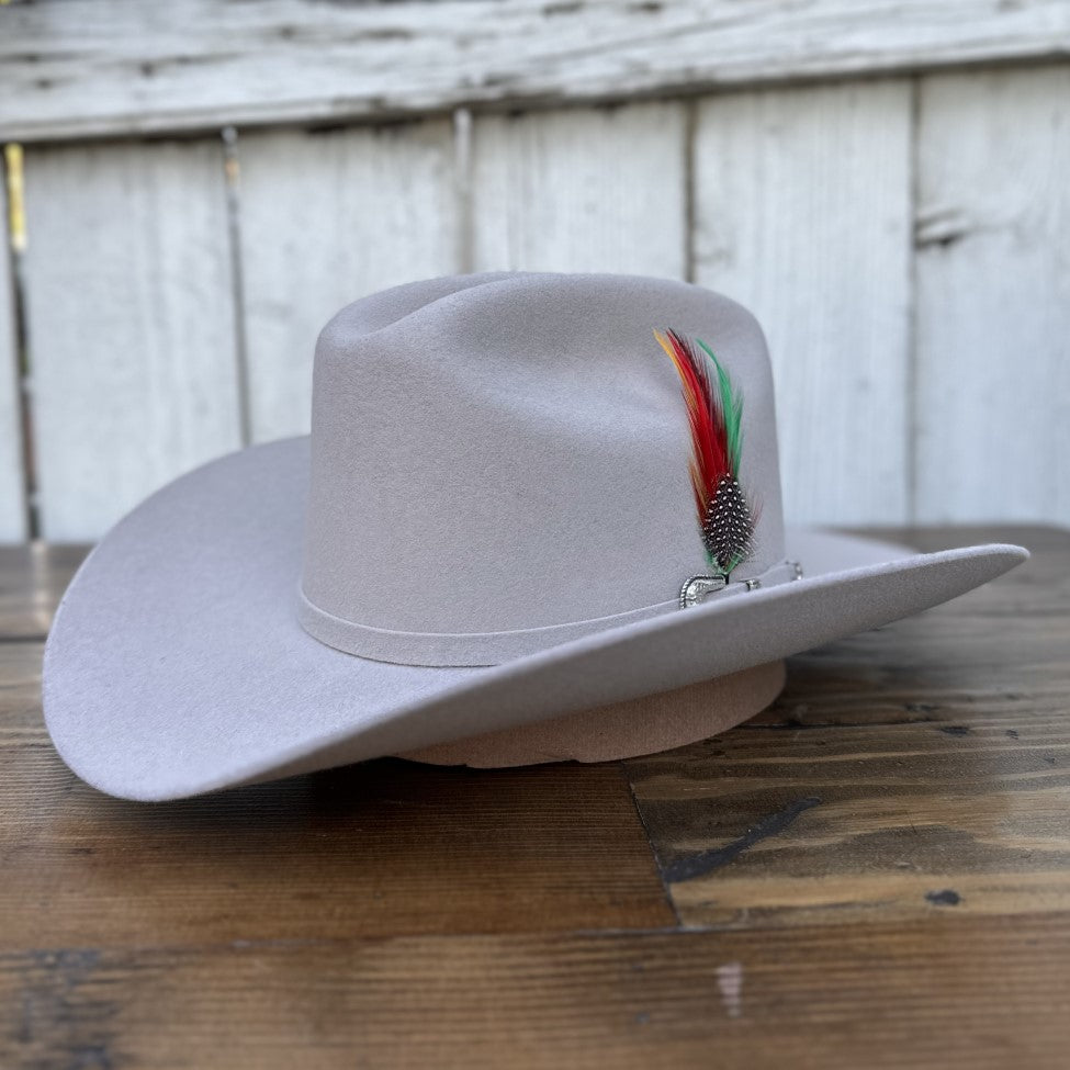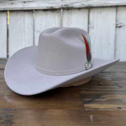 The 6X Chaparral felt hat from Cuernos Chuecos, in a sophisticated gray, is the quintessence of classic and versatile cowboy style. Made from 6X quality felt, this piece features a 3 1/2" brim and 4 1/2" crown, offering a perfect fit and a timeless look. The addition of a decorative feather gives it an elegant and distinctive touch. Made in Mexico, this felt hat is ideal for those looking to combine tradition and modernity in their style.