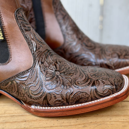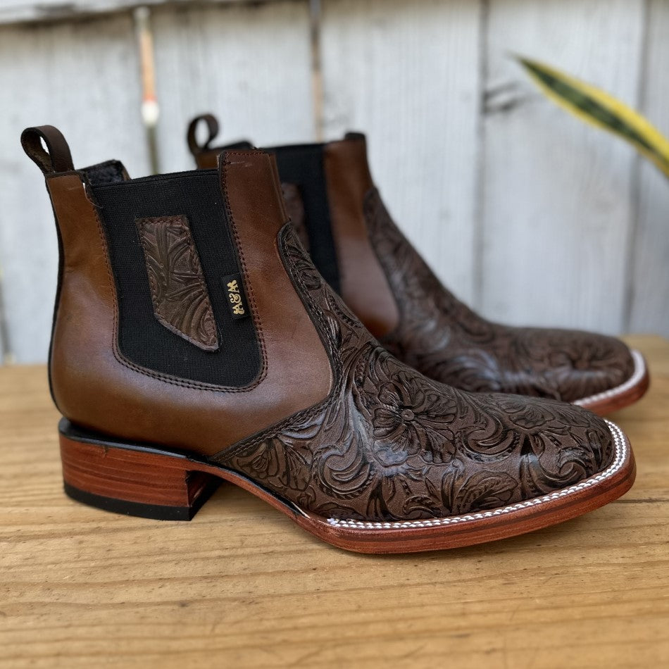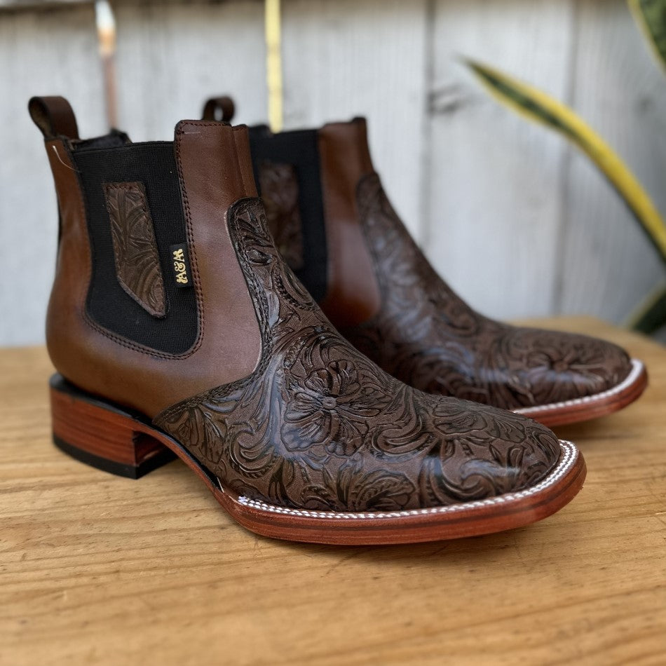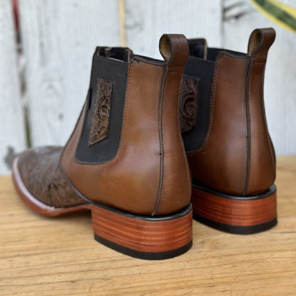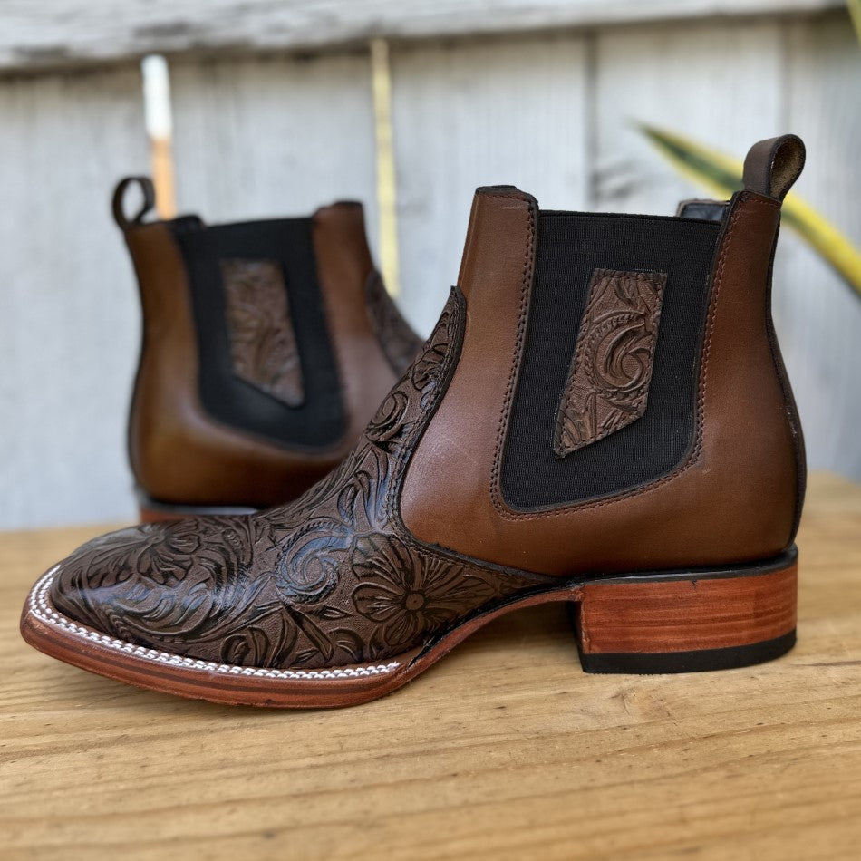 This is the Cheo ankle boot, a masterpiece that stands out for its exquisite chiseled leather. In a brown tone, this boot combines art and fashion with its detailed texture that captures everyone's attention. The square toe not only adds a touch of style, but also offers comfort and space. The leather lining provides a soft fit, while the cowhide sole ensures durability and resistance. Made in León, Mexico, the Cheo is a symbol of Mexican artisanal skill, perfect for those who value detail and quality in their western footwear.