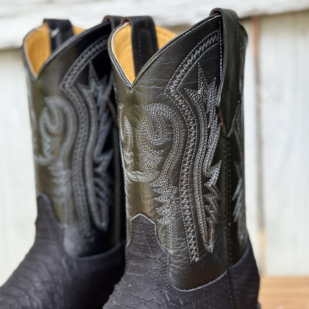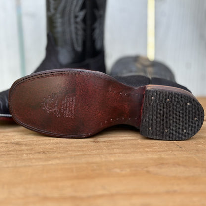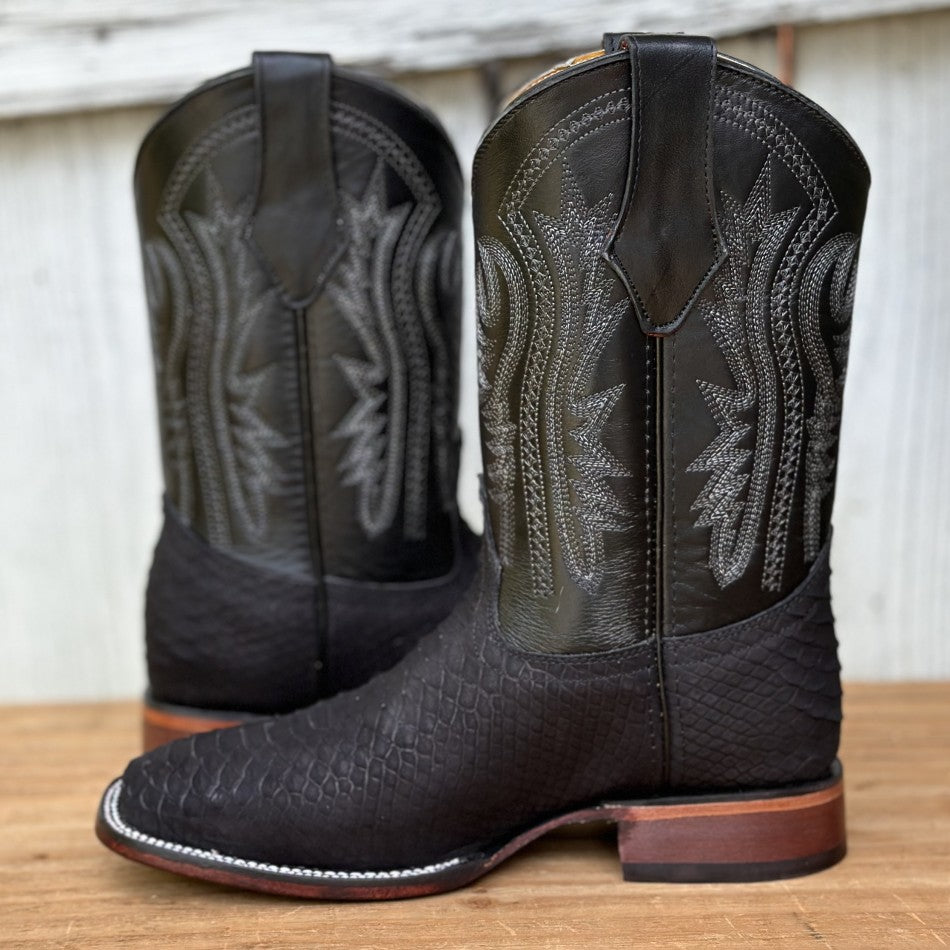 This is the DB-Faux Python Nubuck style in black, a men's exotic western boot with a debossed cowhide upper and a nubuck finish that simulates python's distinctive texture. The heel offers a scaled, matte look, while the shaft features high-contrast embroidery on a smooth base that highlights the classic western boot silhouette. With a 10.5-inch shaft, 1.5-inch heel, cowhide sole, and leather lining, this boot balances presence, style, and texture in an exotic design that stands out with its own personality.