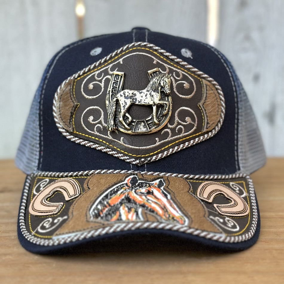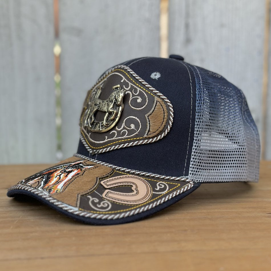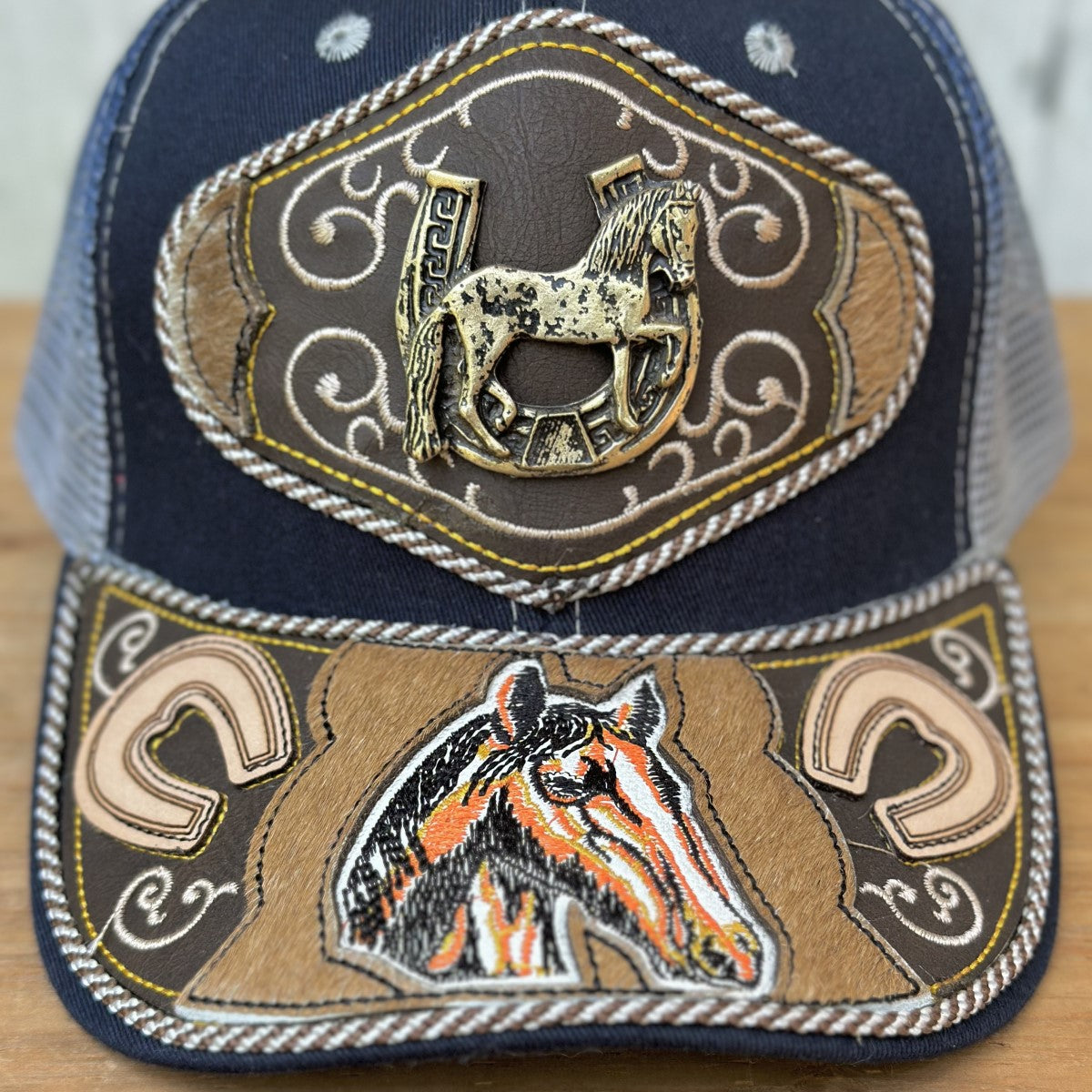 Blue western cap with horse and horseshoe design. Handcrafted in Mexico, it features hand-made details and genuine cowhide on the cap.