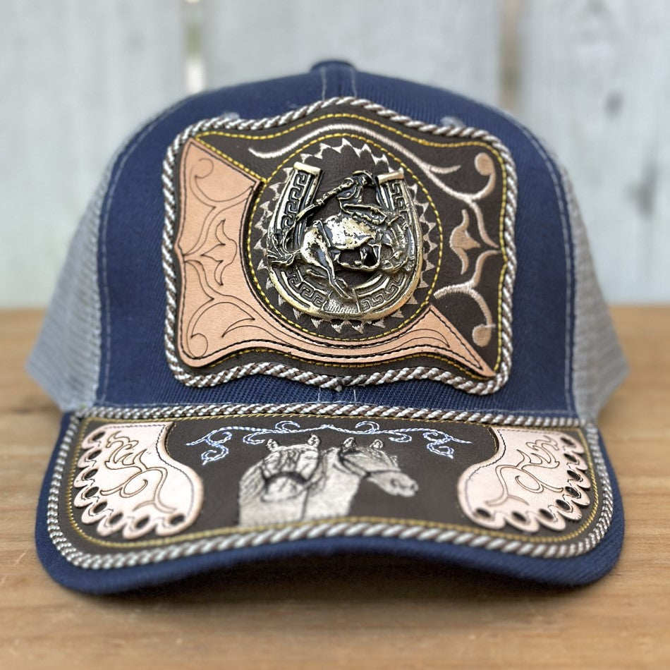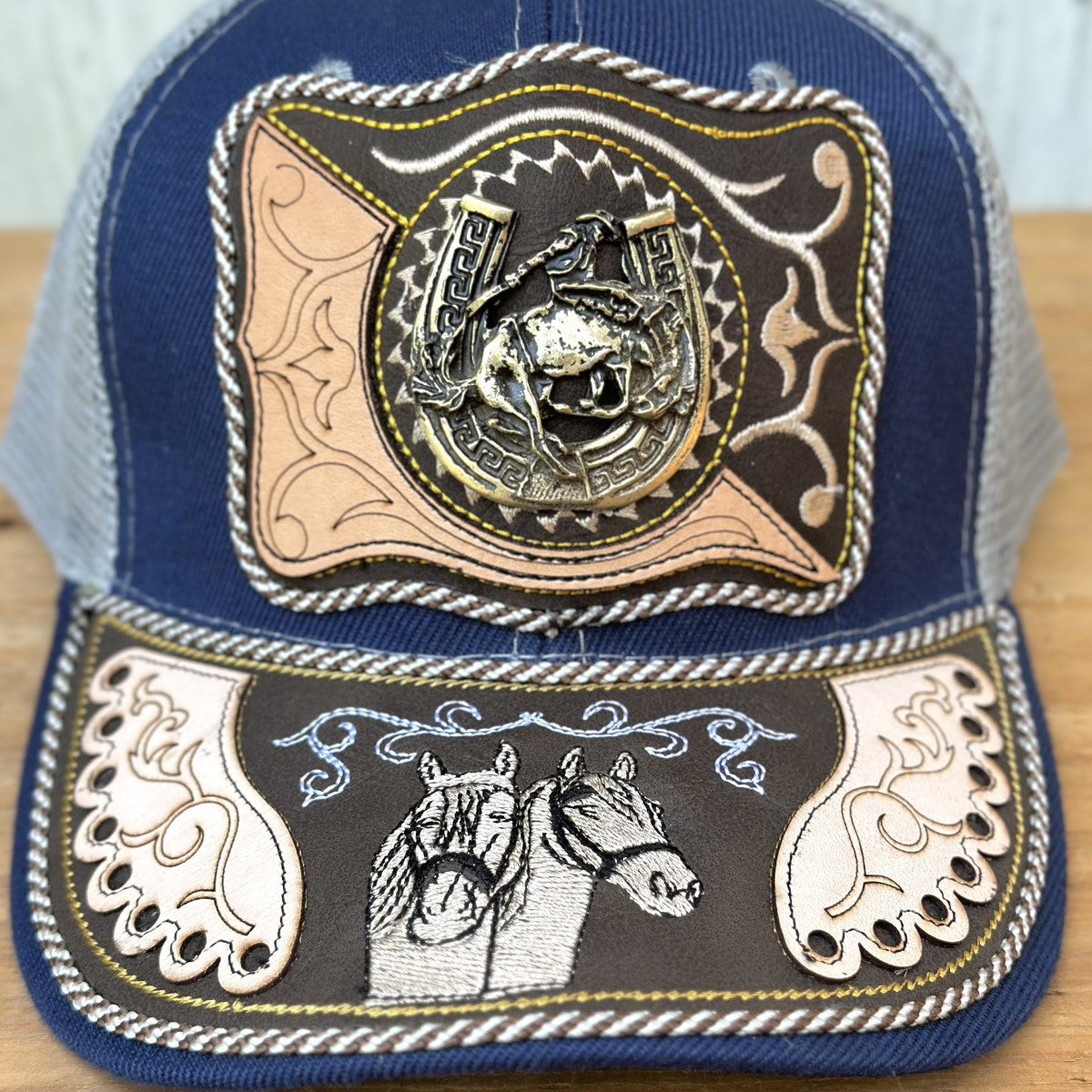 Blue western cap with a horseman and horseshoe design. Handcrafted in Mexico, it features hand-made details and two horses embroidered on the visor. This cap is unique; it is literally a one of one.