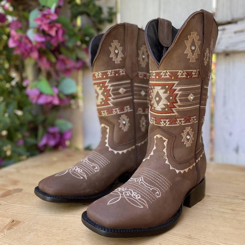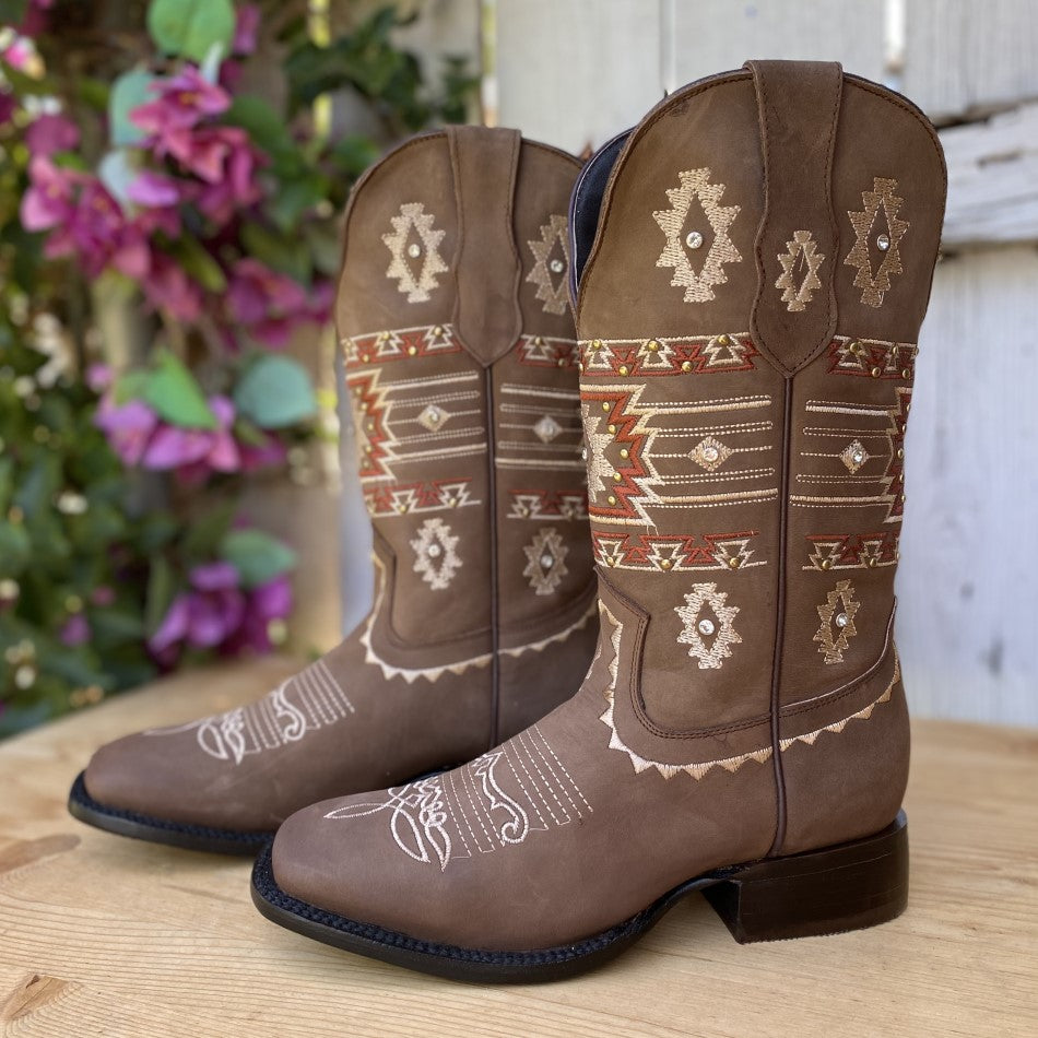This is the JB-Azteca women's western boot, evoking the rich heritage of ancient Mexico with its sand-colored Aztec-inspired embroidery. Adorned with studs that add a subtle shine, this boot fuses history with contemporary fashion. Made with high-quality leather in its upper and lining, and a resistant cowhide sole, it promises comfort and durability. Made in León, Mexico, the JB-Azteca is a tribute to Mexican tradition and craftsmanship
