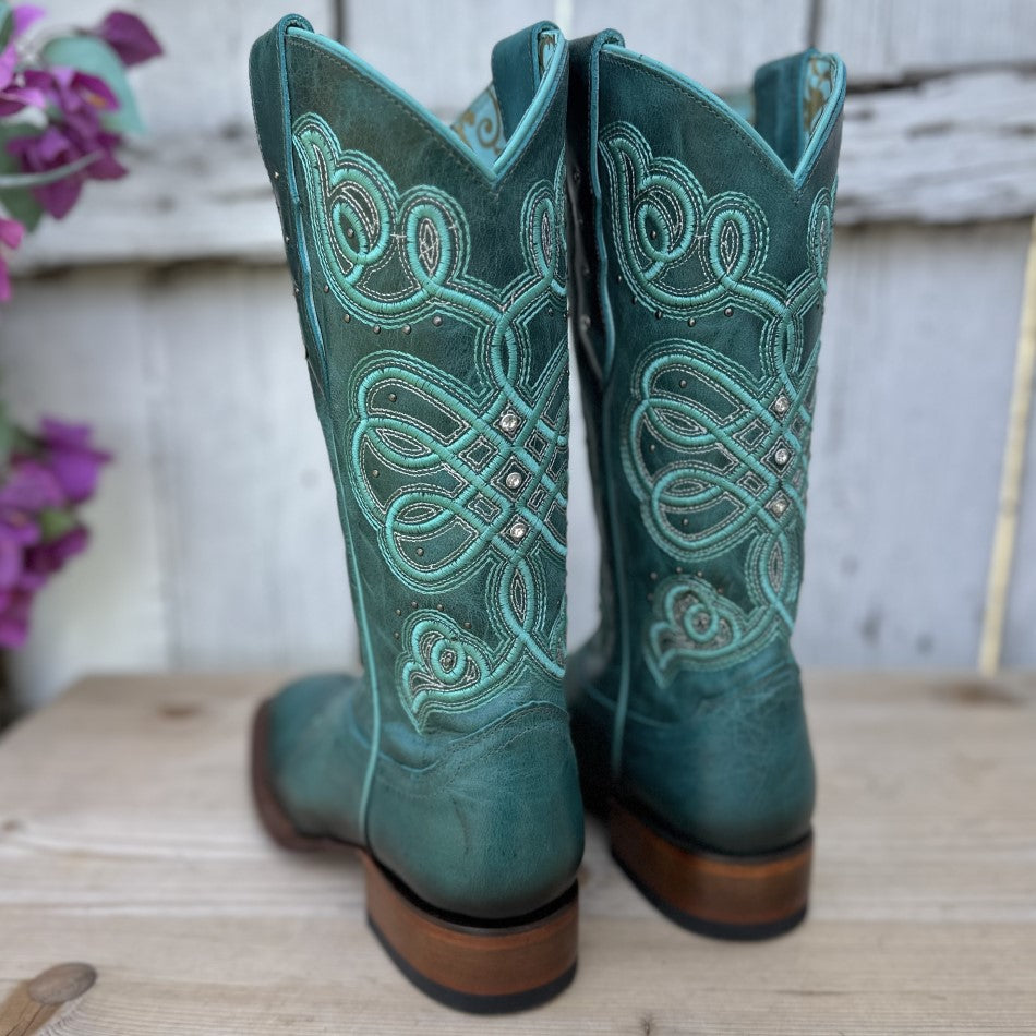 This is the RC-Liz western boot for women, sporting a turquoise color. The square toe gives it a modern profile, while the detailed embroidery and studs add a unique style. With high-quality leather in its upper and lining, and a robust cowhide sole, this boot combines beauty and comfort. Made in Mexico, the RC-Liz is an expression of western fashion that does not go unnoticed.