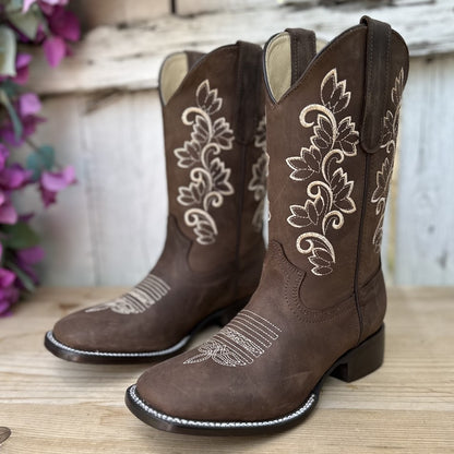 This is the style SB-420 women's western boot, presented in a versatile brown color. With a Bulldog last and square toe, this boot combines traditional comfort with modern design. Simple but authentic floral embroidery adds a touch of natural elegance. Made with crazy leather material, leather upper and lining, and a cowhide sole, it promises durability and comfort. Made in León, Mexico, this style has become a crowd favorite for its perfect fusion of tradition and versatile style.