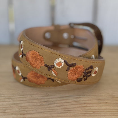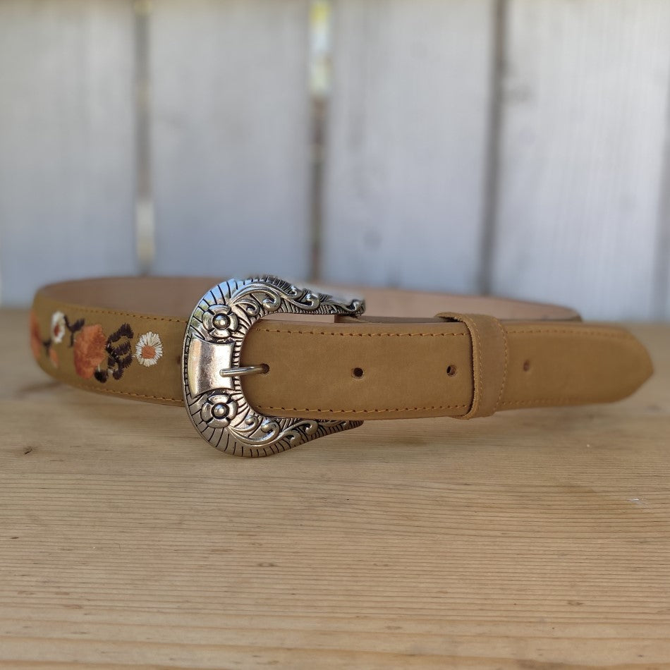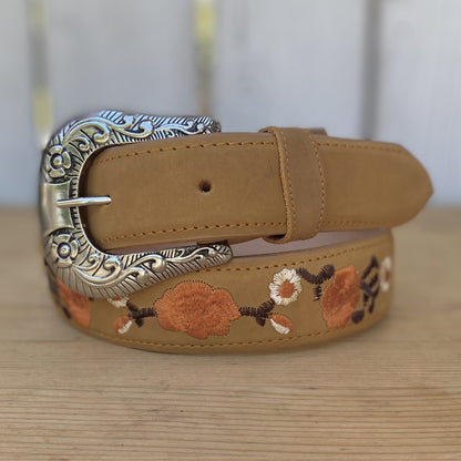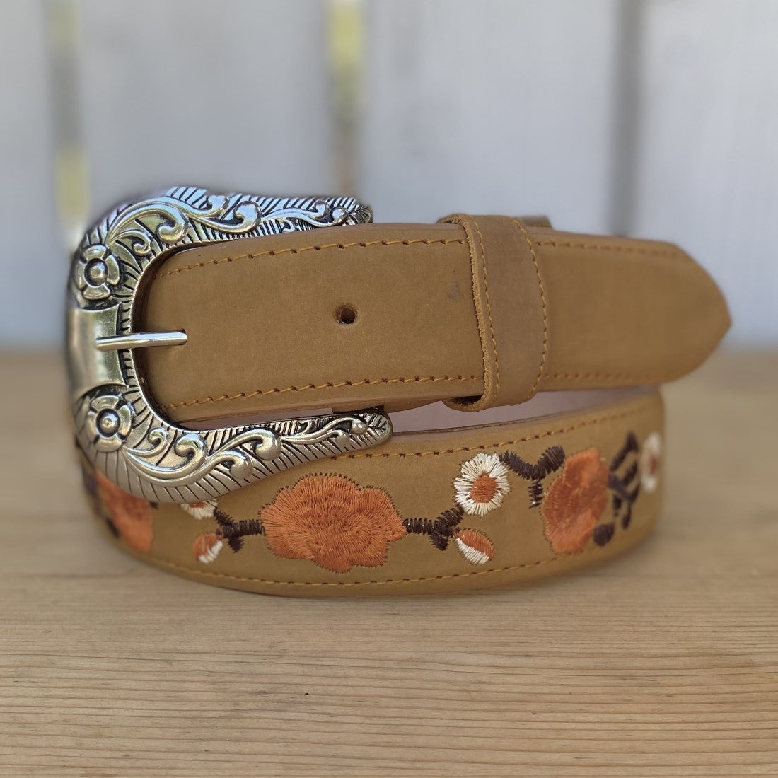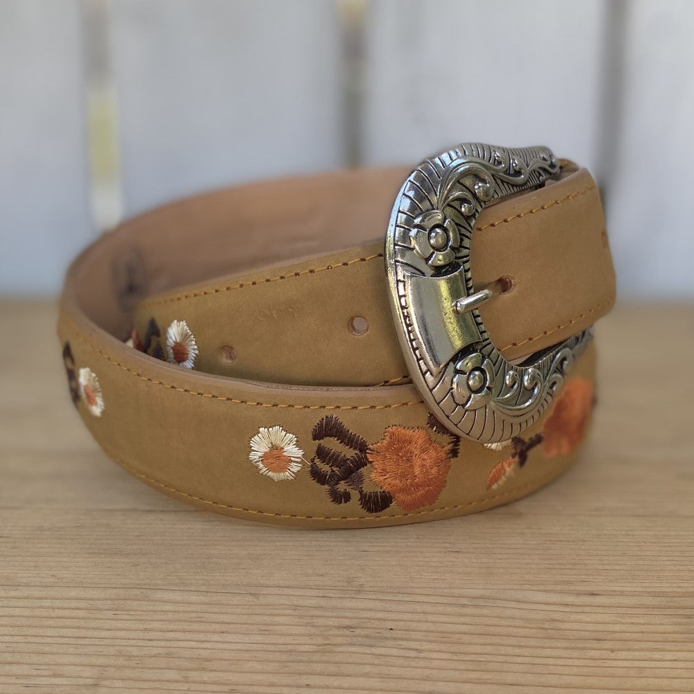 This is the SB-Flores style belt, a charming accessory in honey color that stands out for its elegant embroidered design. Made of 100% genuine leather, this belt not only adds a touch of beauty to any outfit, but also stands out for its popularity. The detailed buckle and flower embroidery create a distinctive look that captures the essence of Mexican western fashion. Made in Mexico, this belt is perfect for those who appreciate artisanal details in their accessories.