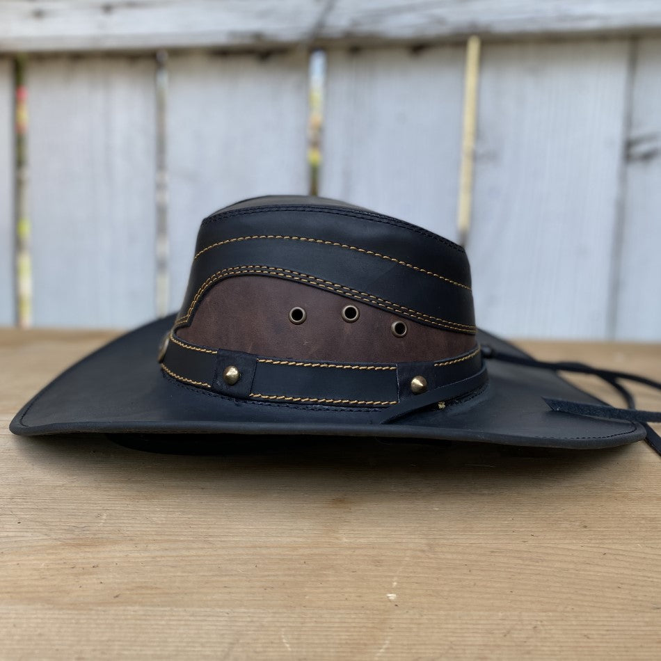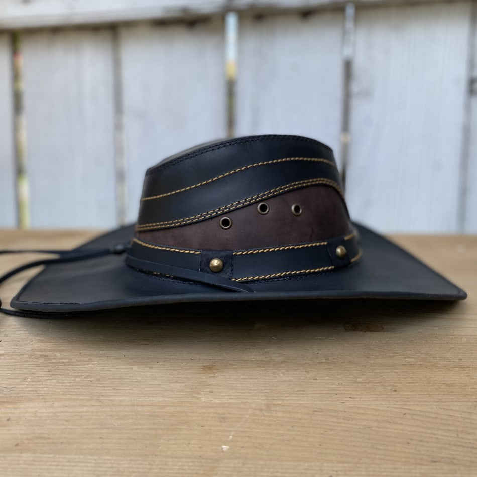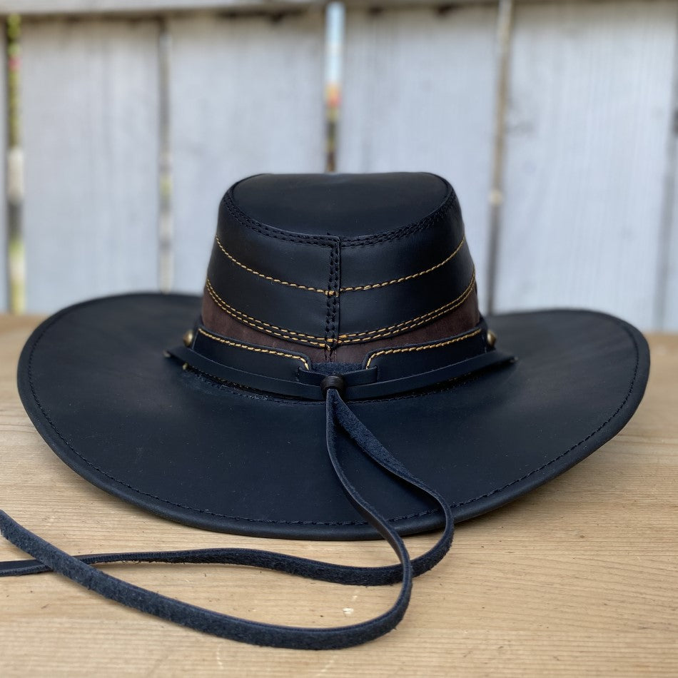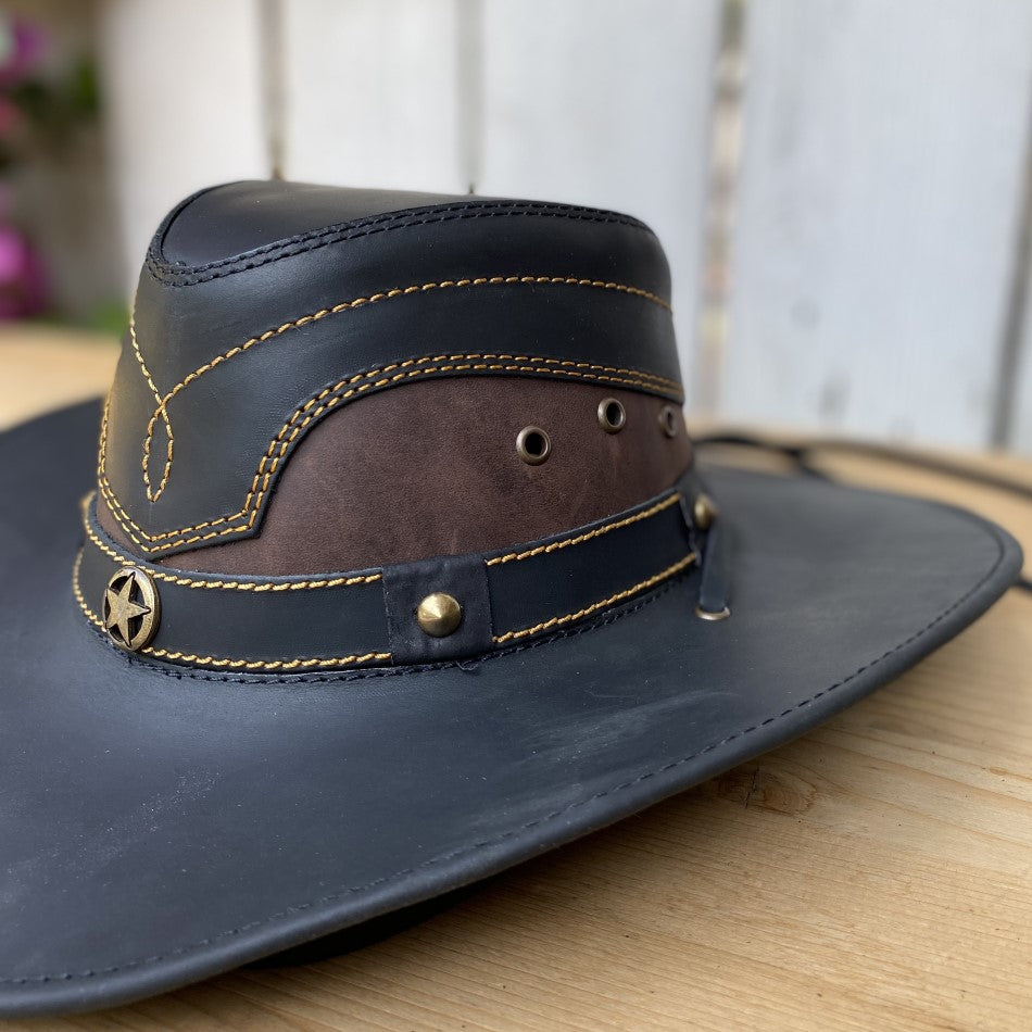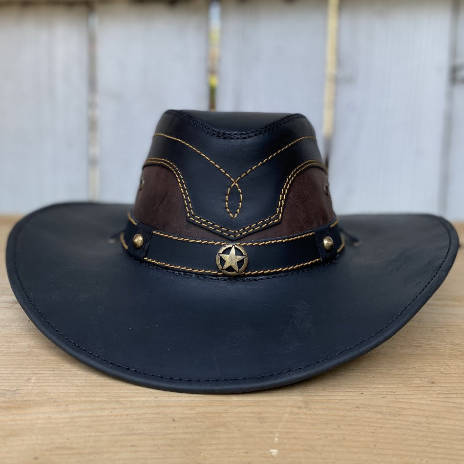 This authentic leather hat, with its distinctive design and a star on the hat band, is a must-have accessory for a unique style. With a 3" brim and 4" crown, this black hat includes an adjustable drawstring for the perfect fit. Made 100% in Mexico, it is ideal for those looking for a quality leather hat with a touch of distinctive character.
