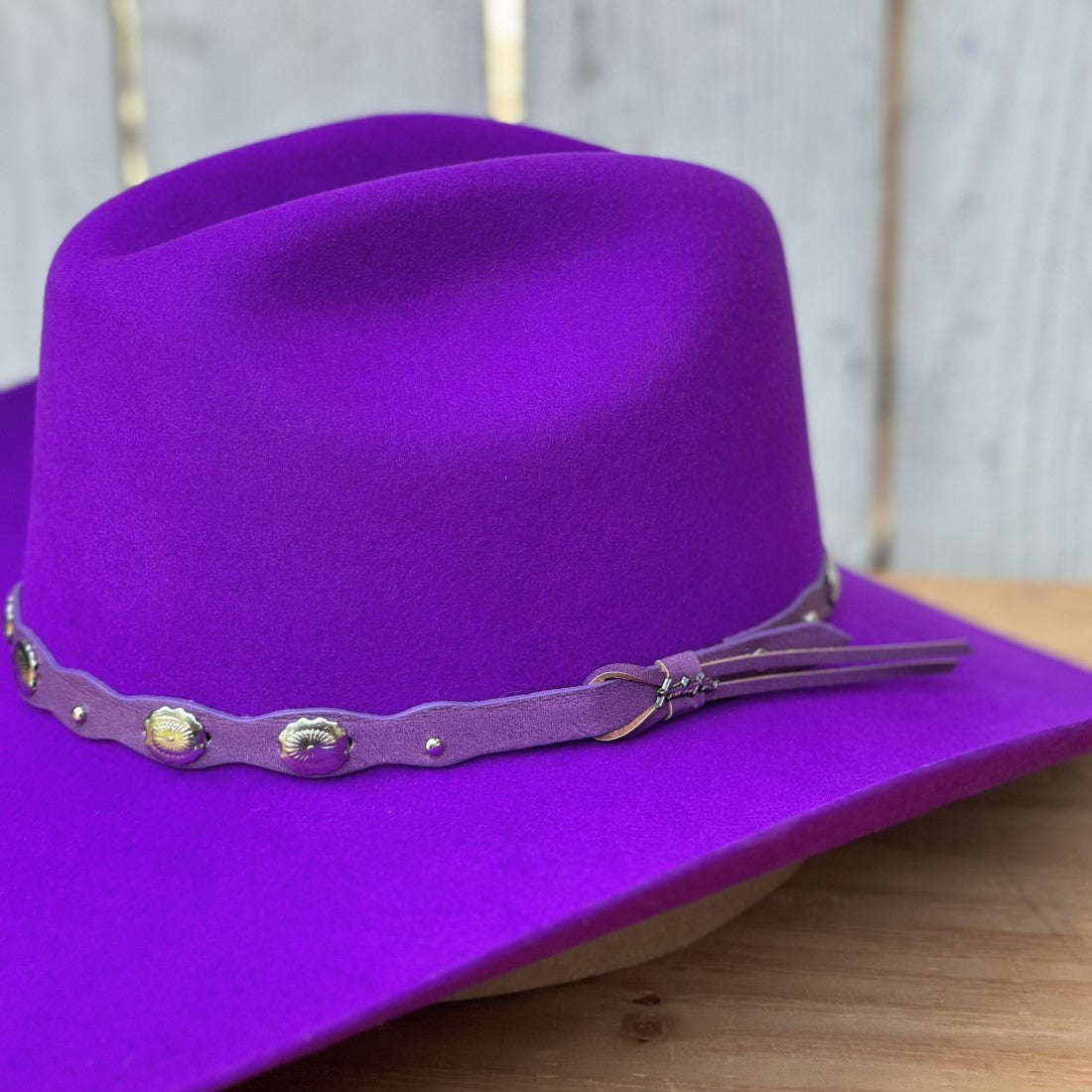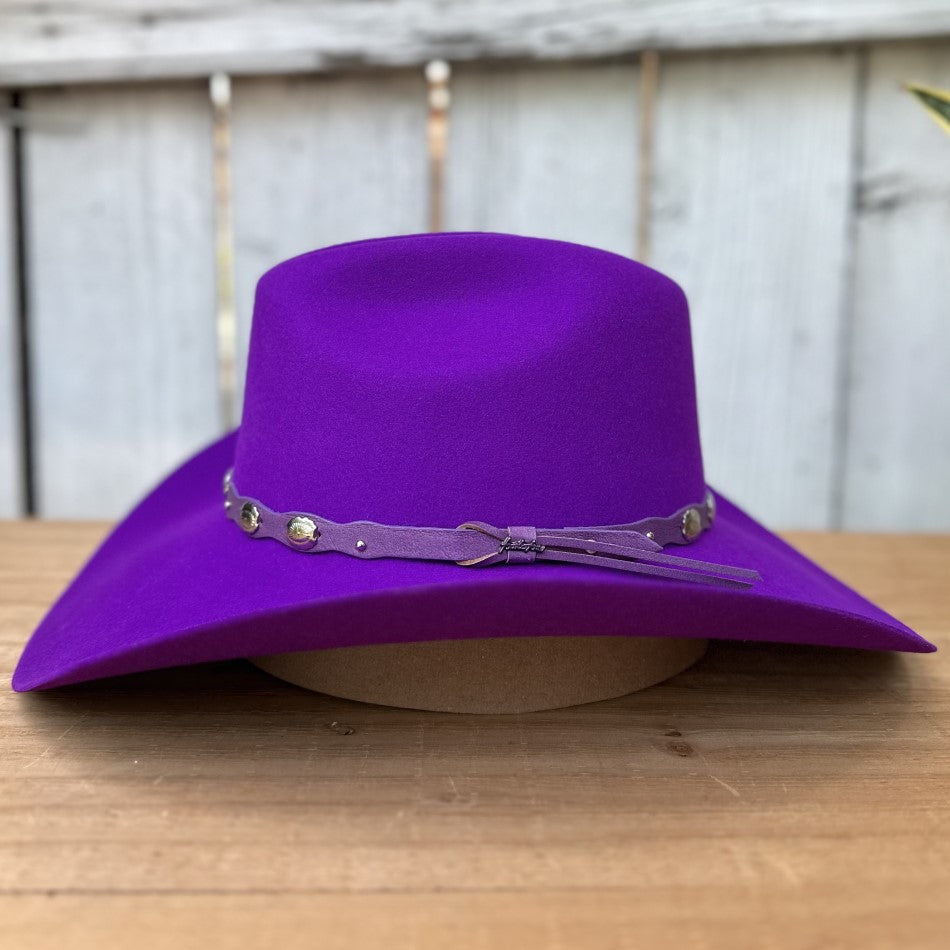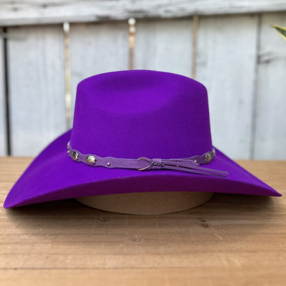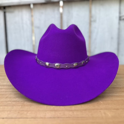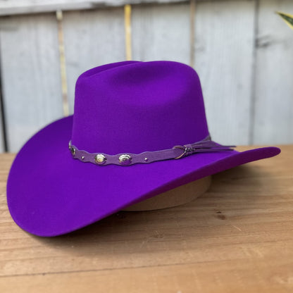 This women's 20X Denver felt hat from Tombstone Hats in a unique purple color is an expression of elegance and exclusivity. The 20X felt ensures durability and comfort, while the hat band accentuates the felt hat with its rich texture and circular metallic trim, adding a classic design element that stands out against the purple felt. With a 3 1/2" brim and 4 1/4" crown, this Mexican-made purple felt hat is perfect for any occasion, pairing perfectly with a variety of styles.