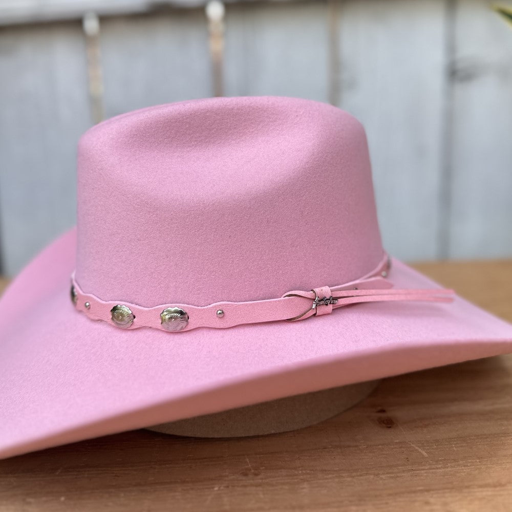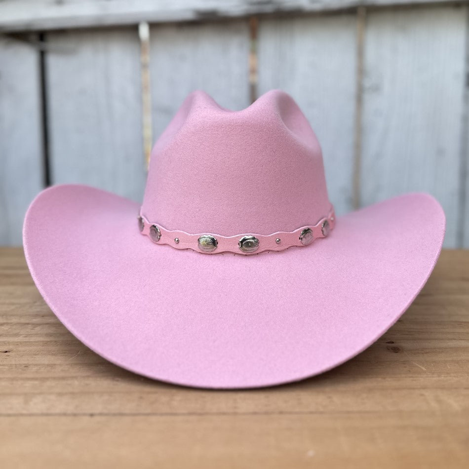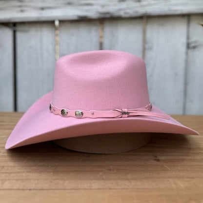 This 20X Denver felt hat from Tombstone Hats in a unique pink color is an expression of elegance and exclusivity. The 20X felt ensures durability and comfort, while the hat band accentuates the felt hat with its rich texture and circular metallic trim, adding a classic design element that stands out against the pink felt. With a 3 1/2" brim and 4 1/4" crown, this Mexican-made pink felt hat is perfect for any occasion, pairing perfectly with a variety of styles.