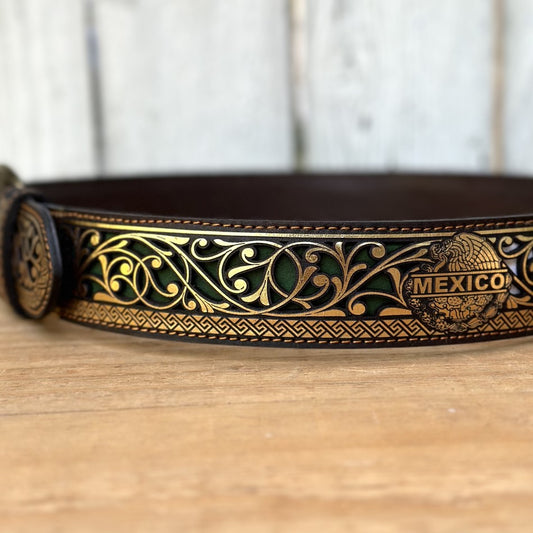 Cinturón Dorado Cortado a Láser "Mexico" con Fondo Verde, Blanco y Rojo - Cinturones Vaqueros para Hombre