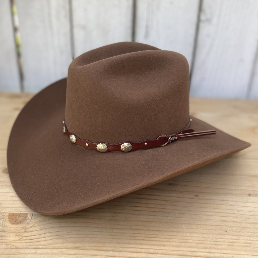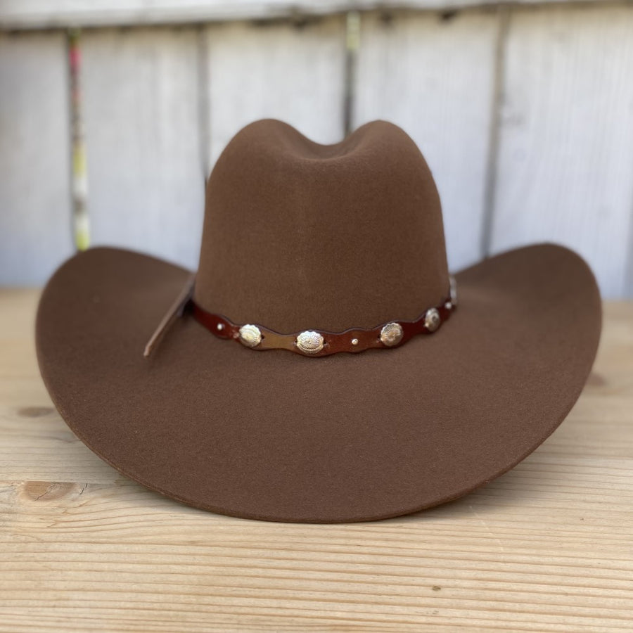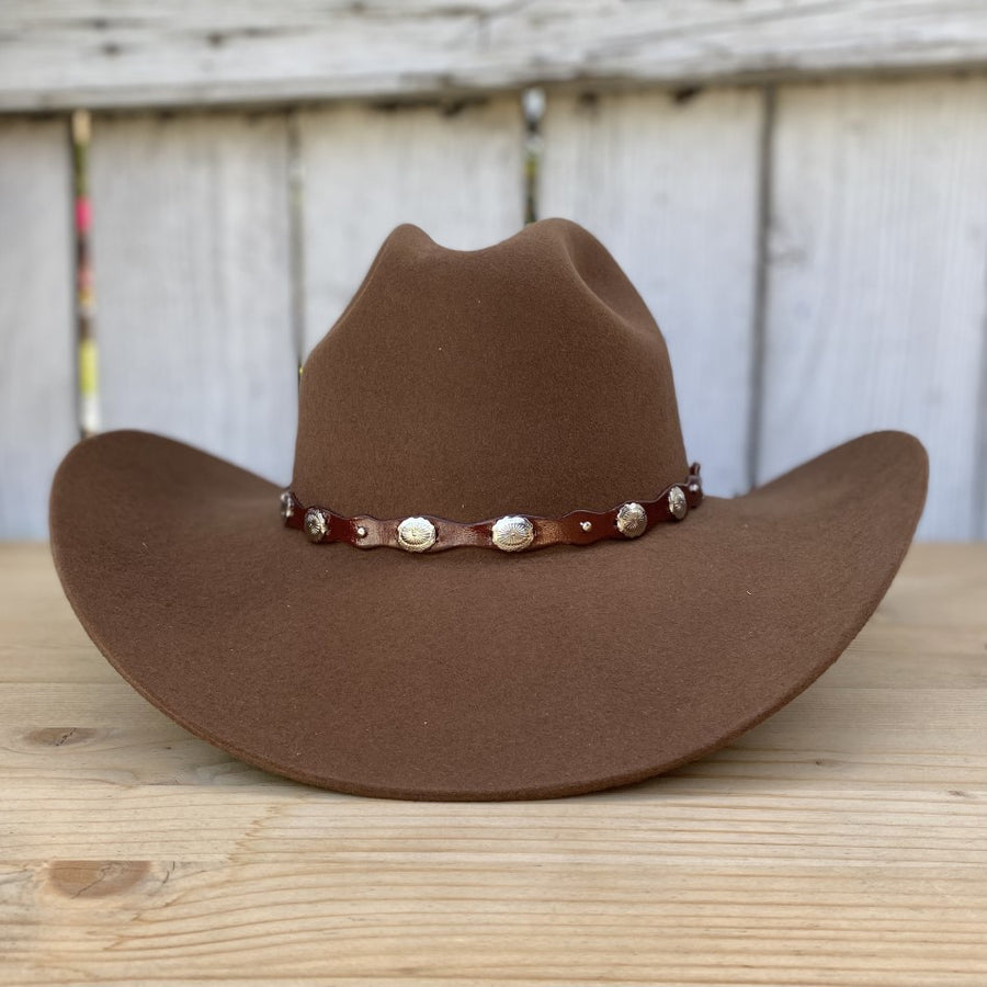 Esta texana 20X Denver de Tombstone Hats en color nutria es una expresión de elegancia. El fieltro de calidad 20X garantiza durabilidad y confort, mientras que la toquilla acentúa el sombrero con su textura rica y adornos metálicos circulares, añadiendo un elemento de diseño clásico que resalta contra el fieltro de tono nutria. Con una falda de 3 1/2" y una copa de 4 1/4", este sombrero hecho en México es perfecto para cualquier ocasión, combinando a la perfección con una variedad de estilos.