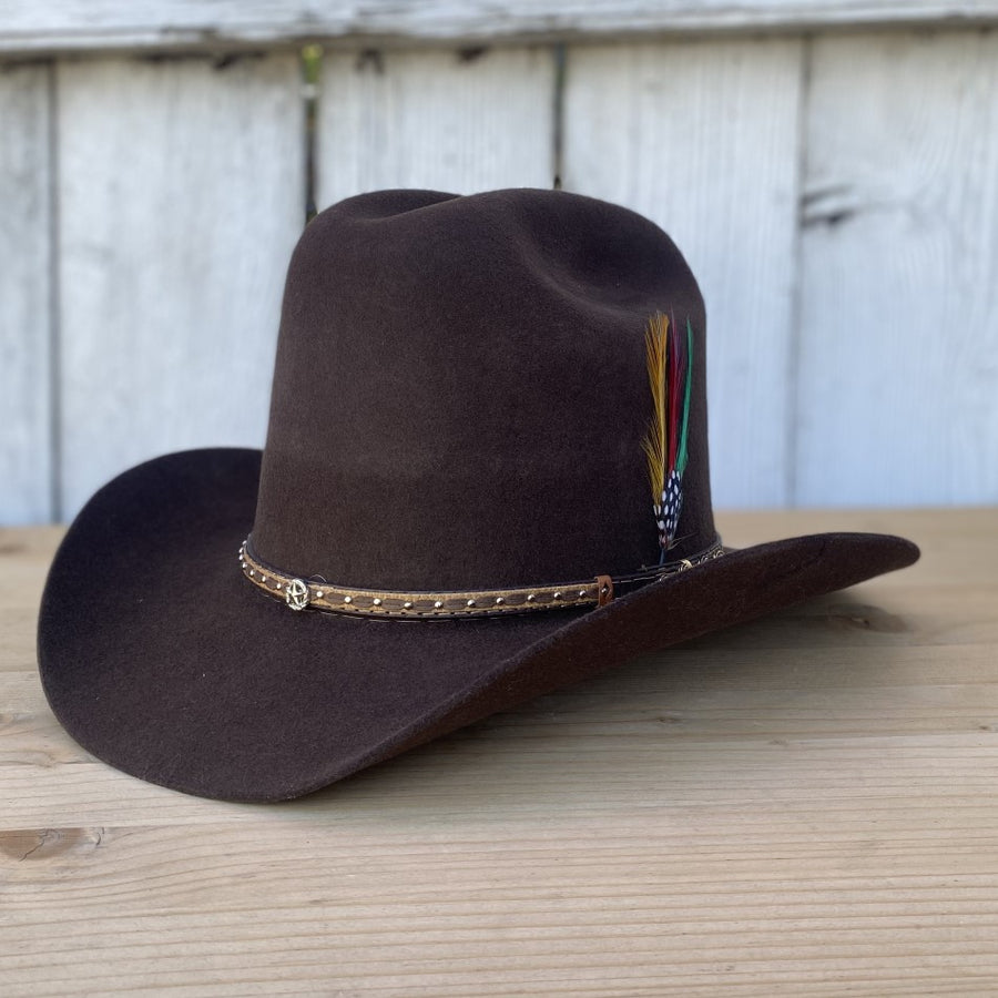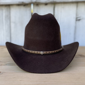 La texana 20X El Viejon de Rocha Hats en un color cafe es una pieza clásica con un toque moderno. Su calidad de fieltro 20X y la silueta definida por una falda de 3 1/4" y una copa de 5" se complementan con una pluma de 4", aportando una elegancia sutil. Las toquillas varían, pero siempre realzan la belleza de la texana. Esta texana cafe, hecha en México, es perfecta para los aficionados a las texanas de copa alta y refinamiento.