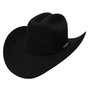 Esta es la texana estilo 6X Joan en color negro. Hecha en México con material tipo fieltro, cuenta con una copa moldeada de 4 1/4" con hendidura al centro y doble pliegue al frente. La falda mide 4", con curvatura clásica hacia los lados. Incluye una toquilla negra y broche metálico de la marca Cuernos Chuecos. Es parte de nuestra colección de texanas vaqueras disponibles en Bota Exótica.