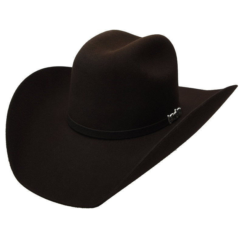 Esta es la texana estilo 6X Oscar en color café, hecha en México con material tipo fieltro. Tiene una copa moldeada de 4 1/4" con hendidura central y doble pliegue al frente, y una falda del mismo tamaño con curva definida en los costados. Incluye una toquilla del mismo color y broche metálico de la marca Cuernos Chuecos en el lateral. Es parte de nuestra colección de texanas vaqueras disponibles aquí en Bota Exótica.