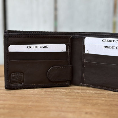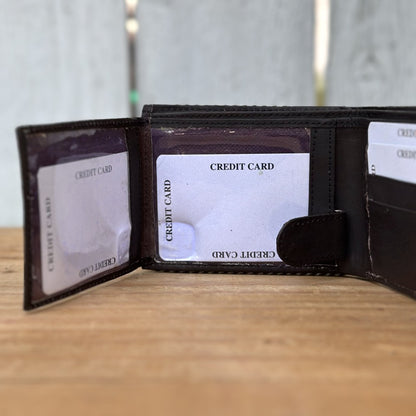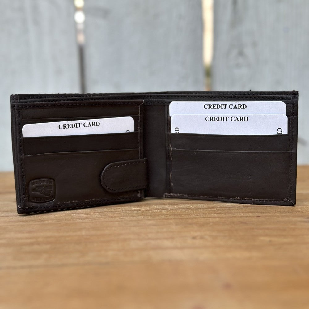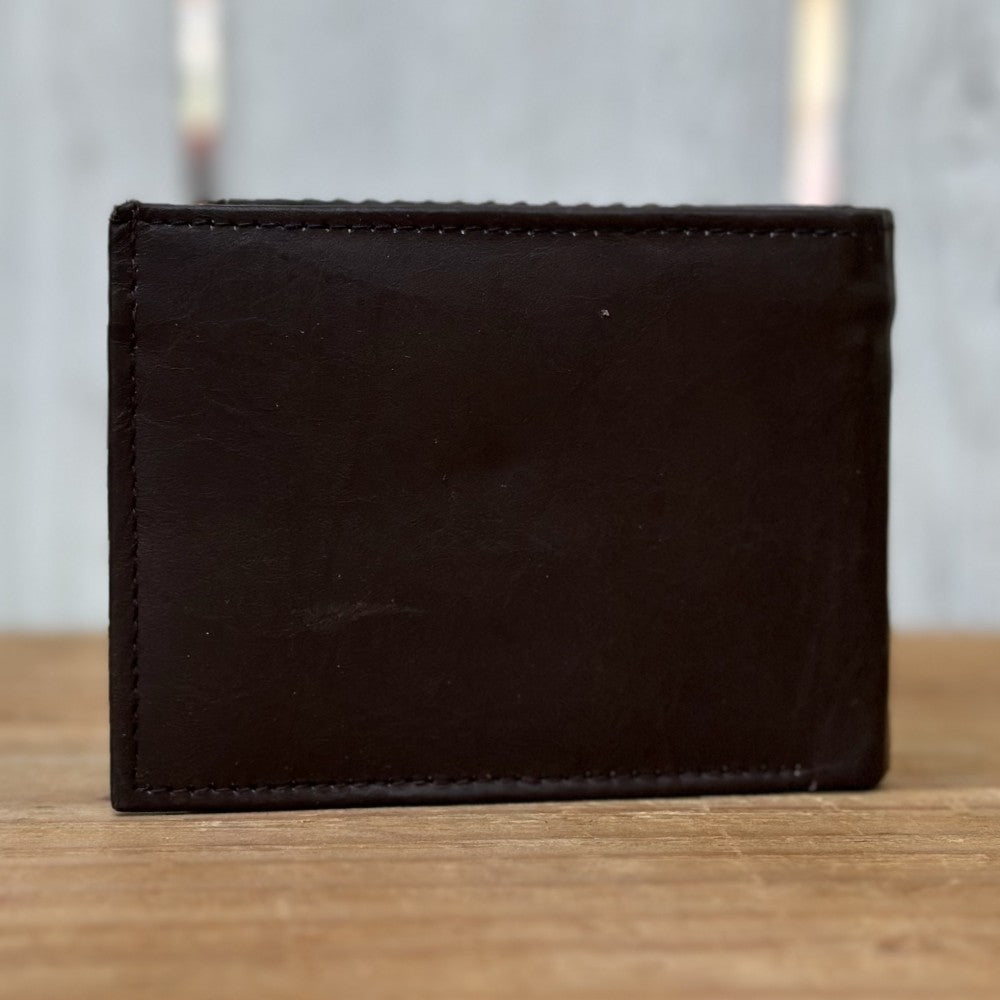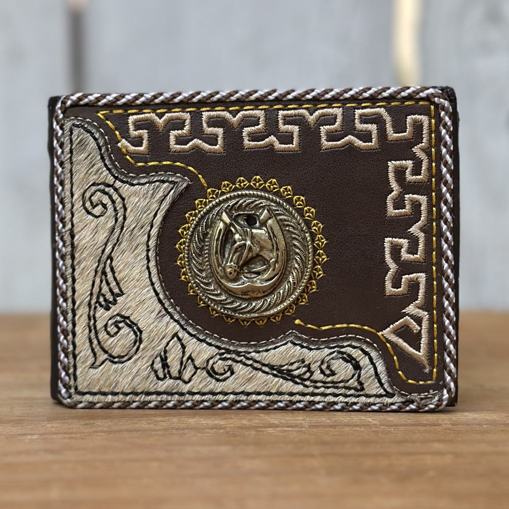 Cartera vaquera para hombre con diseño que combina cuero café y secciones con textura de pelo de res grabado con detalles decorativos. En el centro, presenta un adorno metálico en relieve con la figura de una cabeza de caballo, rodeado por un marco dorado. El diseño incluye grecas bordadas en blanco en la parte superior y lateral derecha, con costuras visibles en tono dorado. La cartera está hecha de piel genuina y mide aproximadamente 9 pulgadas completamente extendida y 3 1/2” de alto. Hecha en México.