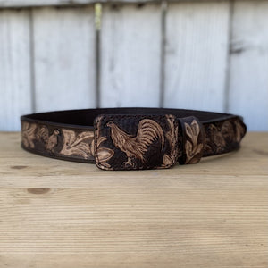 Cinturon Cincelado Cafe con Gallos Personalizable - Cinturones Vaqueros