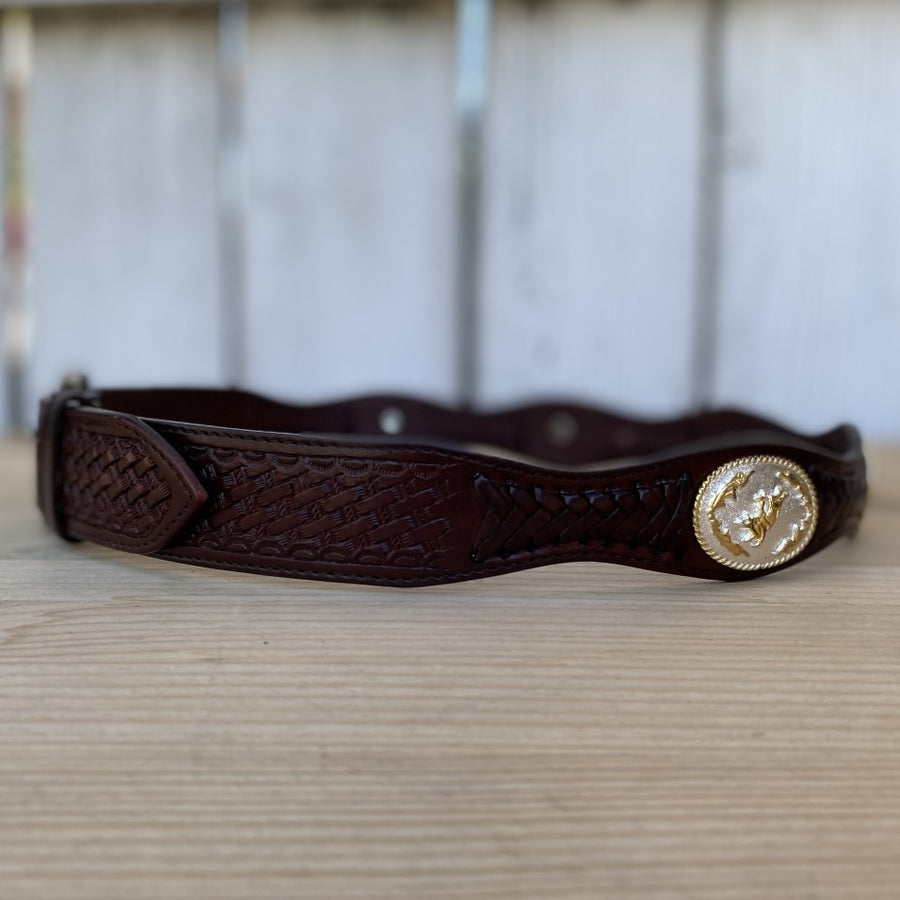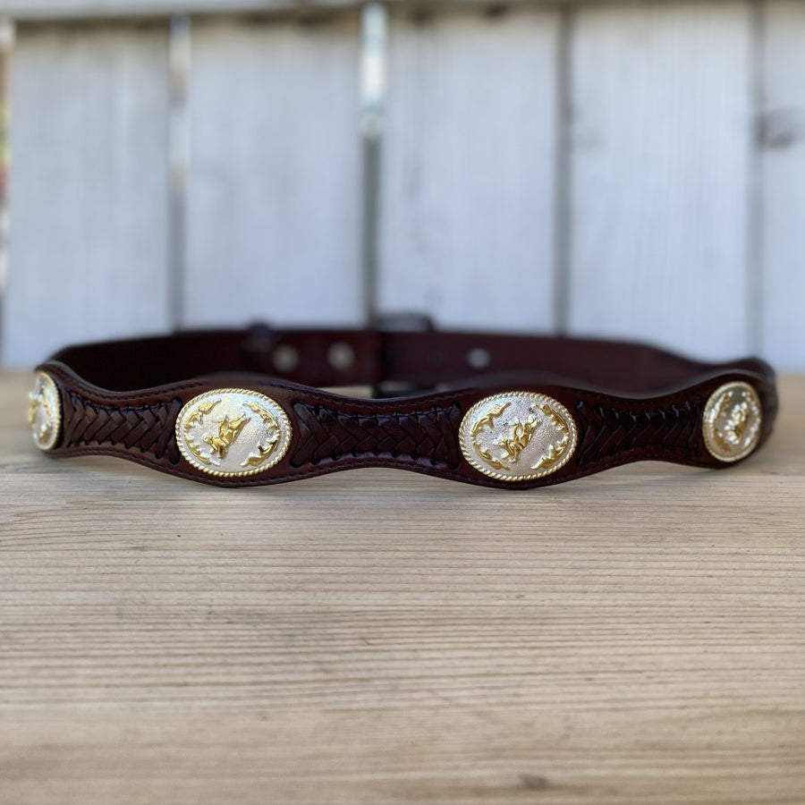 Este cinturón con conchos en tono café oscuro ofrece un estilo distintivo y versátil. Fabricado con 100% piel genuina, su diseño presenta detalles bordados y conchos dorados y plateados, que añaden un toque de elegancia. Tiene un ancho de 1 1/2" y una hebilla removible. Hecho completamente en México, este cinturón es ideal para quienes buscan un accesorio de alta calidad con un diseño llamativo. Perfecto para ocasiones especiales o para añadir un toque de lujo a tu vestimenta, es un cinturón popular entre aquellos que aprecian el estilo vaquero.