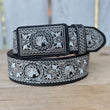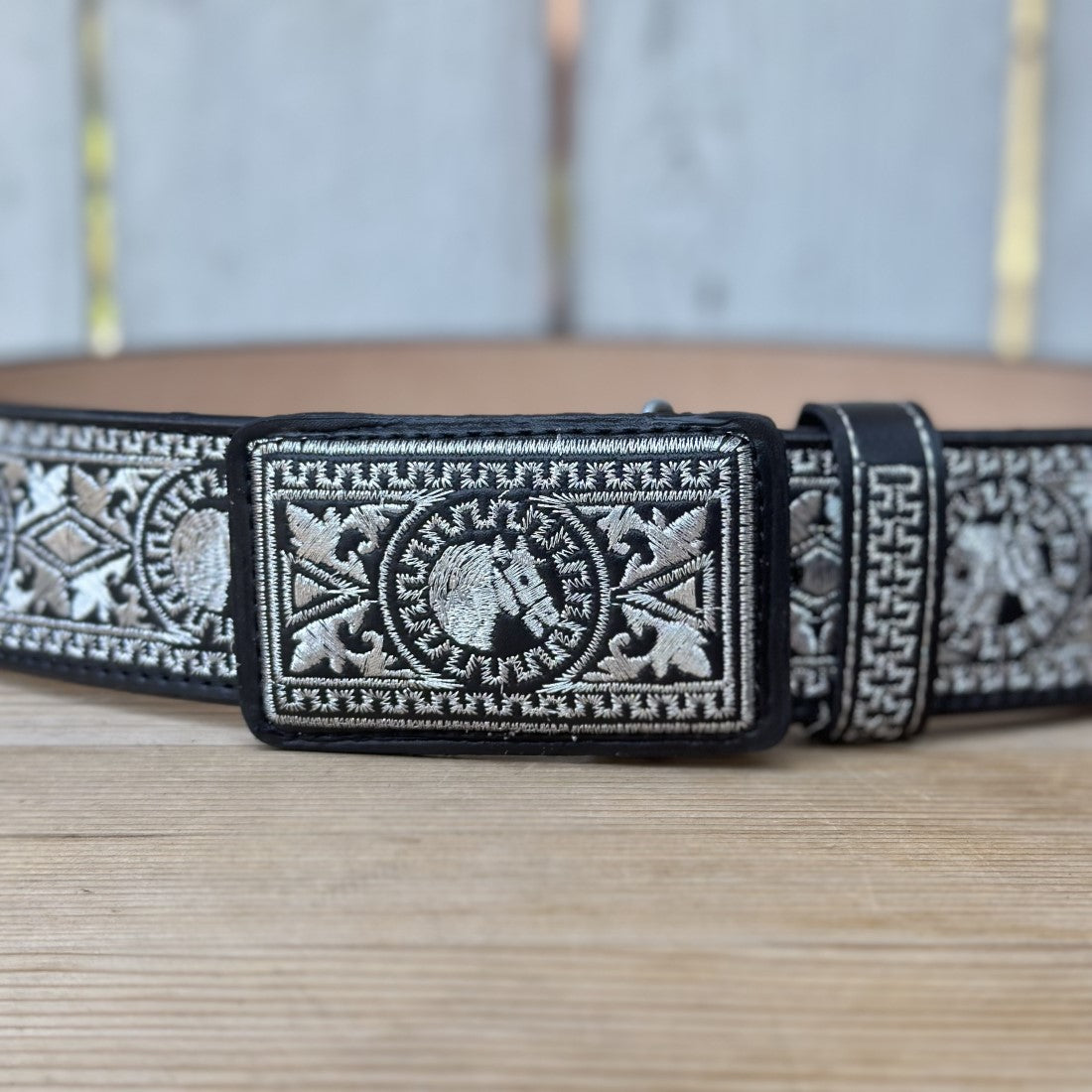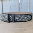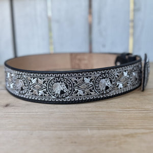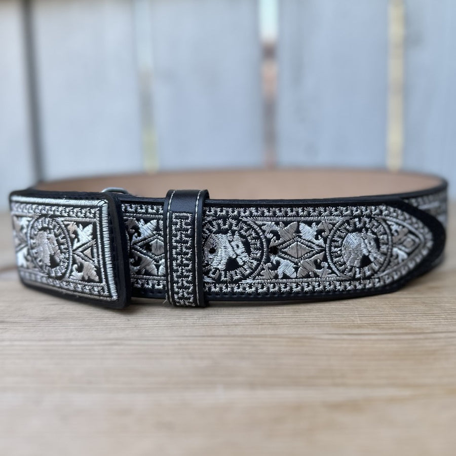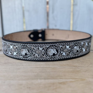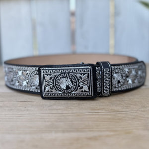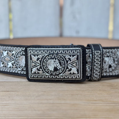 Este es el cinturón 13188 Negro Caballo, parte de nuestra colección de cinturones bordados con hilo metálico. El cinturón es de color negro con un ancho de 2 pulgadas y presenta un diseño de caballo bordado tanto en la hebilla como a lo largo del cinturón. Está hecho de piel genuina y fue elaborado en México. El diseño con bordados plateados le da un toque distinguido, ideal para quienes buscan un accesorio vaquero con estilo.