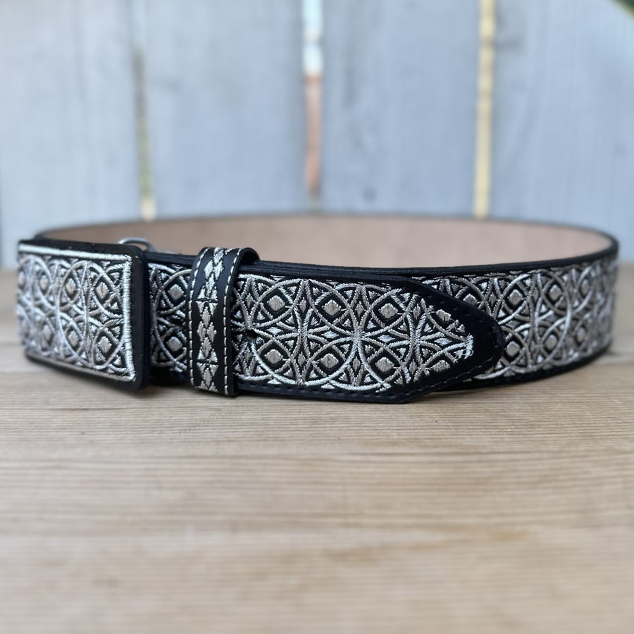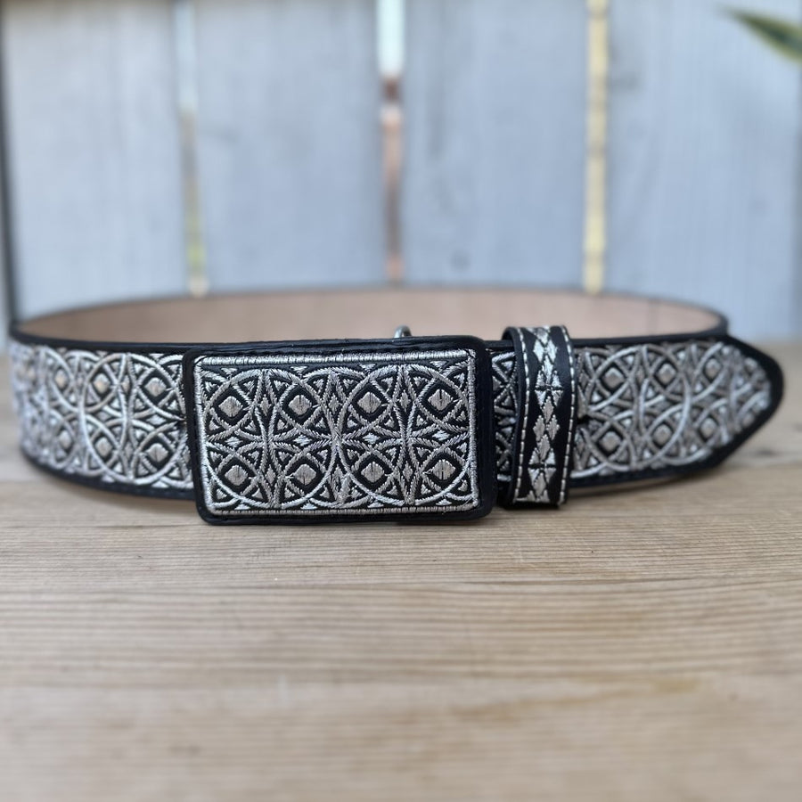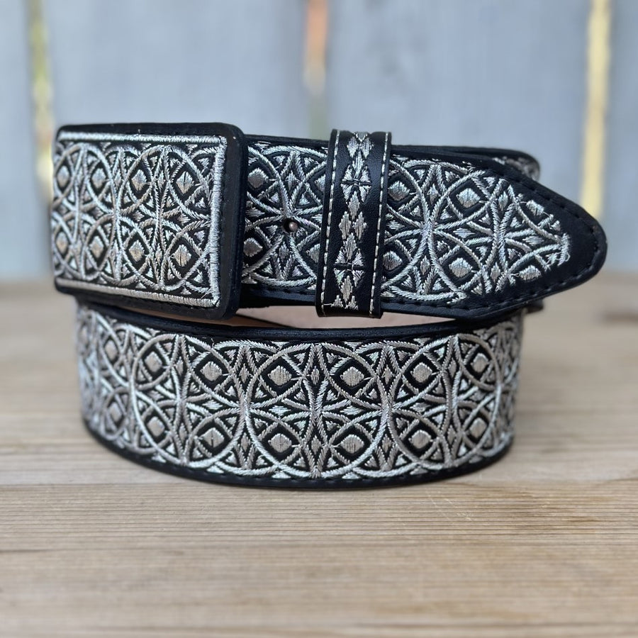 Este es el cinturón 13189 Negro Circular, parte de nuestra colección de cinturones bordados con hilo metálico. Con su diseño de patrones circulares en hilo metálico y detalles elaborados, es una chulada de cinturón, mostrando un estilo único y versátil. Tiene un ancho de 2 pulgadas y está hecho de piel genuina de alta calidad. Su color negro lo hace adaptable a diferentes estilos. Un cinturón muy artesanal que refleja el arte del trabajo mexicano. Hecho en México.