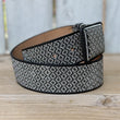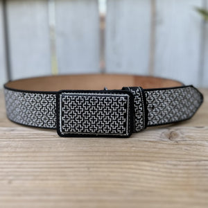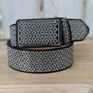 Este es el cinturón 13184 Negro Cruz, parte de nuestra colección de cinturones bordados con hilo metálico. Presenta un tono negro que resalta el intrincado diseño de cruces bordadas, tanto en el cinturón como en la hebilla rectangular. El detalle del bordado resalta la habilidad artesanal que distingue a estos cinturones. El cinturón tiene un ancho de 2 pulgadas y está fabricado con piel genuina, asegurando durabilidad y estilo. Hecho en México, este cinturón es un testimonio de la tradición vaquera con un toque de elegancia.