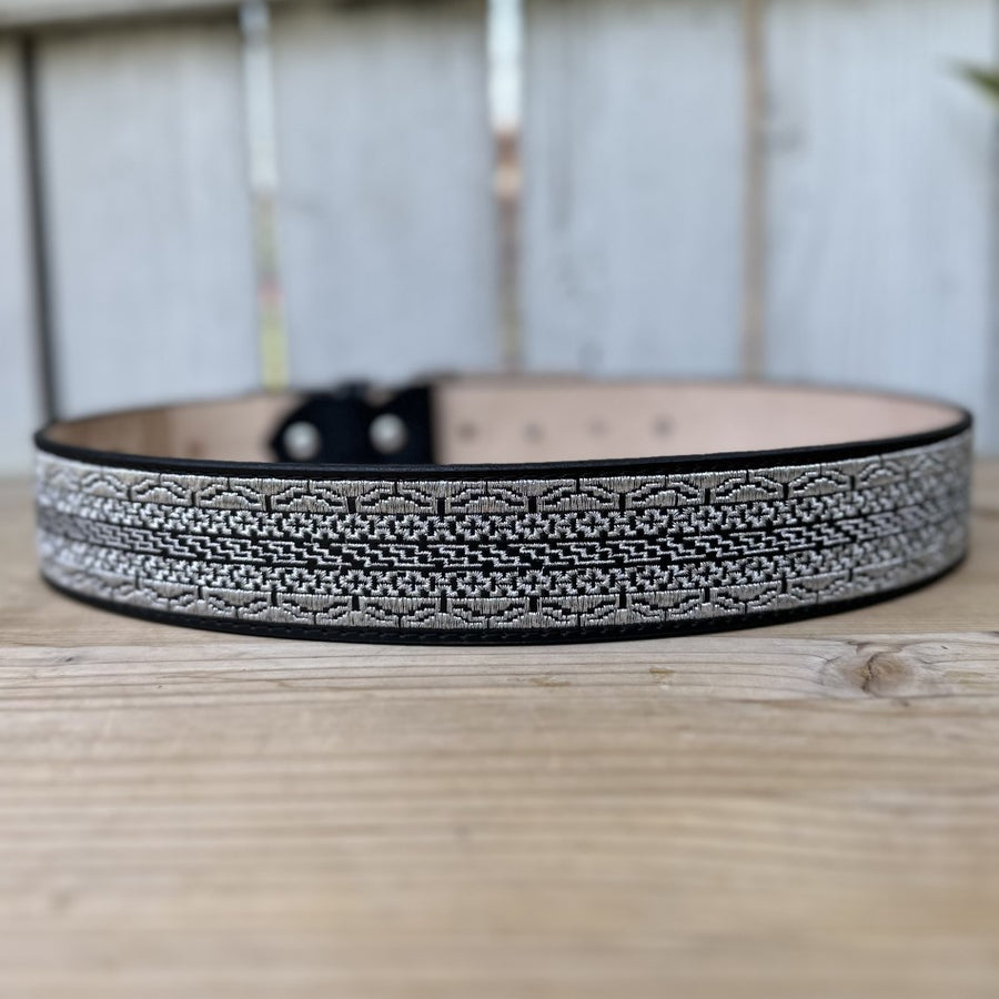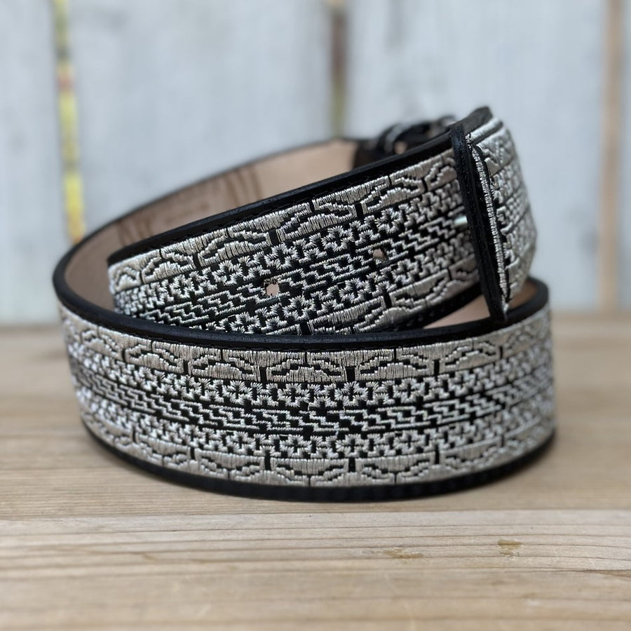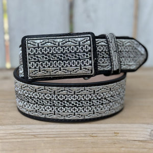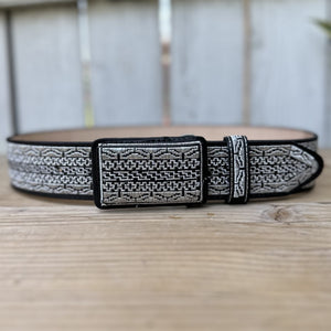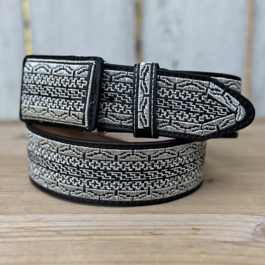 Este es el cinturón 13185 Negro Greca, parte de nuestra colección de cinturones bordados con hilo metálico. Presenta un diseño greca en tonos metálicos que cubre todo el cinturón, destacando sobre el fondo negro para un contraste llamativo. La hebilla rectangular comparte el mismo patrón, creando una apariencia uniforme y distintiva. Con un ancho de 2 pulgadas, está elaborado con piel genuina y hecho en México. Ideal para quienes buscan un accesorio con estilo greca que aporte un toque especial a su atuendo.