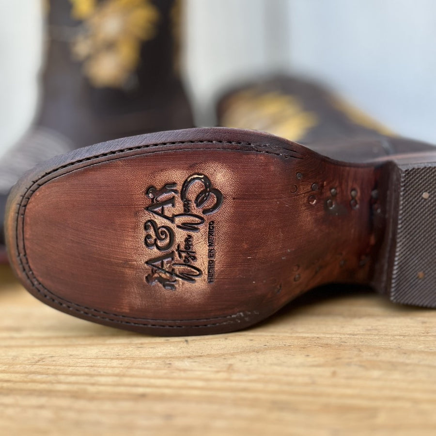 La bota vaquera DA-041 es una muestra de elegancia con su bordado dorado y otoñal sobre fondo café, destacando el meticuloso trabajo artesanal. La estructura de la bota, con forro y corte de piel, garantiza calidad y confort, mientras la suela de vaqueta y la punta cuadrada combinan durabilidad con un estilo clásico. Hecha en León, México, esta bota vaquera es ideal para quien aprecia la autenticidad y el diseño que refleja el otoño.