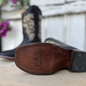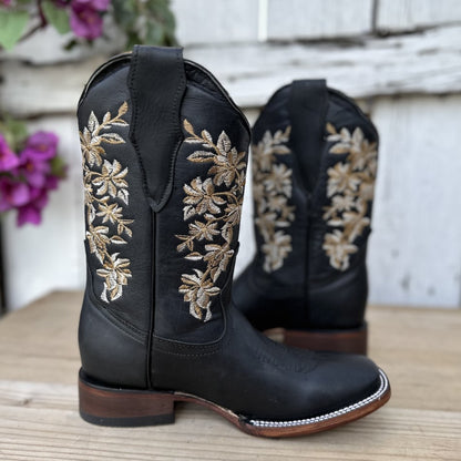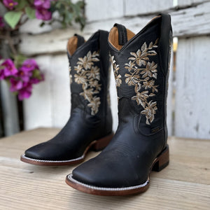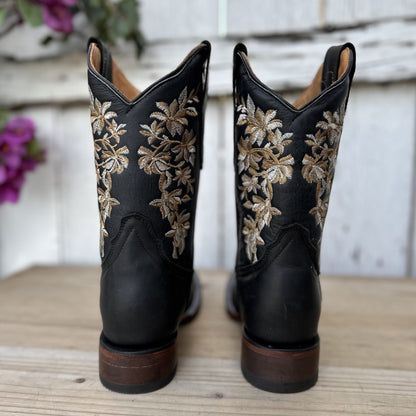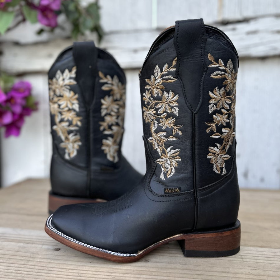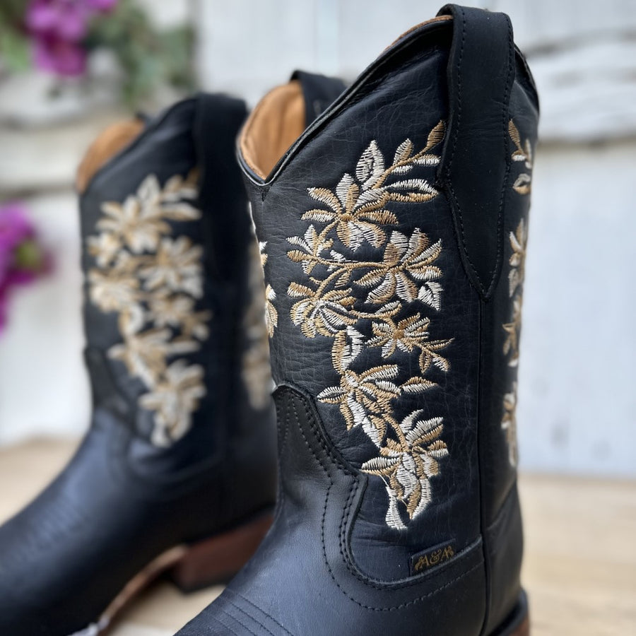 La bota vaquera Caprichosa, en un versátil negro, es perfecta para un estilo casual con su tubo corto de 10 pulgadas. Su vibrante diseño floral añade un toque lleno de vida y color. Confeccionada en piel crazy para durabilidad, tiene un cómodo tacón de 1 1/2 pulgadas y suela de vaqueta. Hecha en León, México, esta bota combina calidad artesanal con un diseño fresco y moderno.