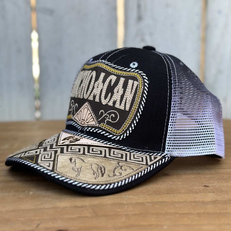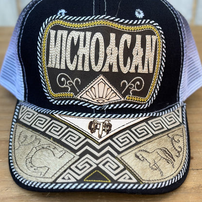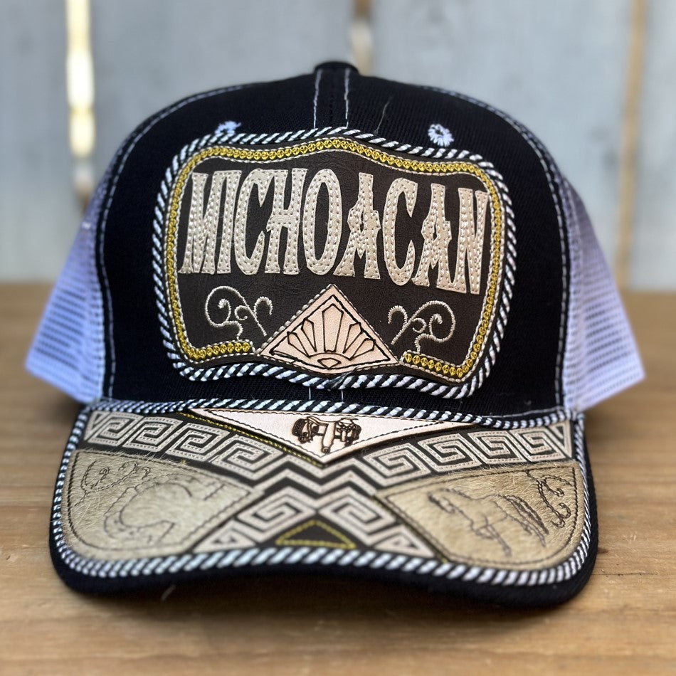 Gorra negra de Michoacán con bordados artesanales en la visera. Si eres de Michoacán, esta gorra es para ti.