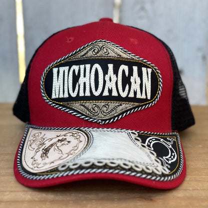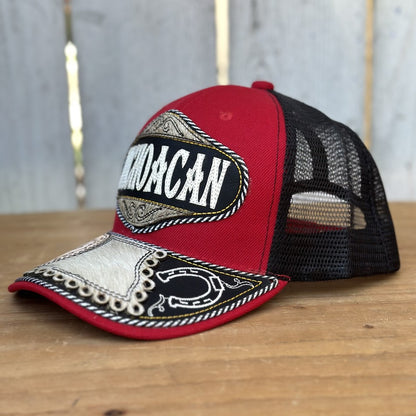 Gorra roja de Michoacán con pelo de res en la visera. Si eres de Michoacán, esta gorra es para ti.