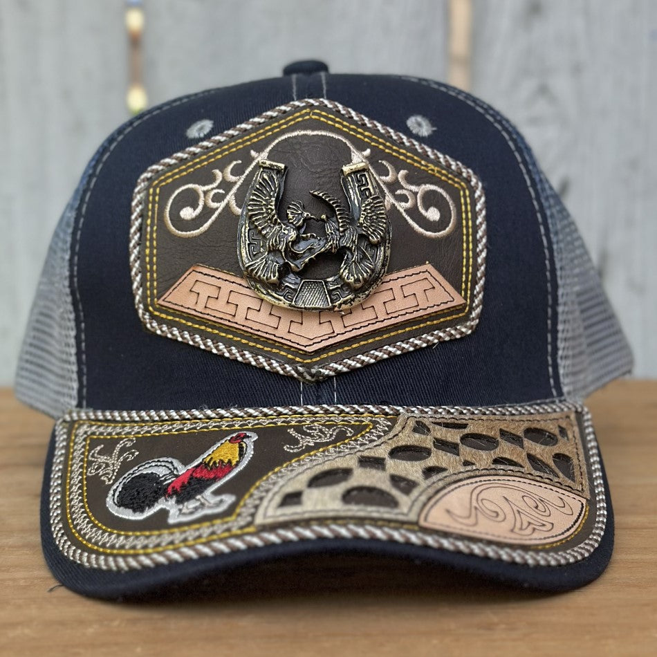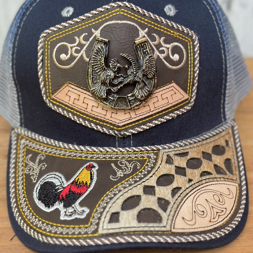 Gorra vaquera azul con diseño de dos gallos y una herradura. Hecha artesanalmente en México, cuenta con detalles hechos a mano y pelo de res auténtico en la gorra